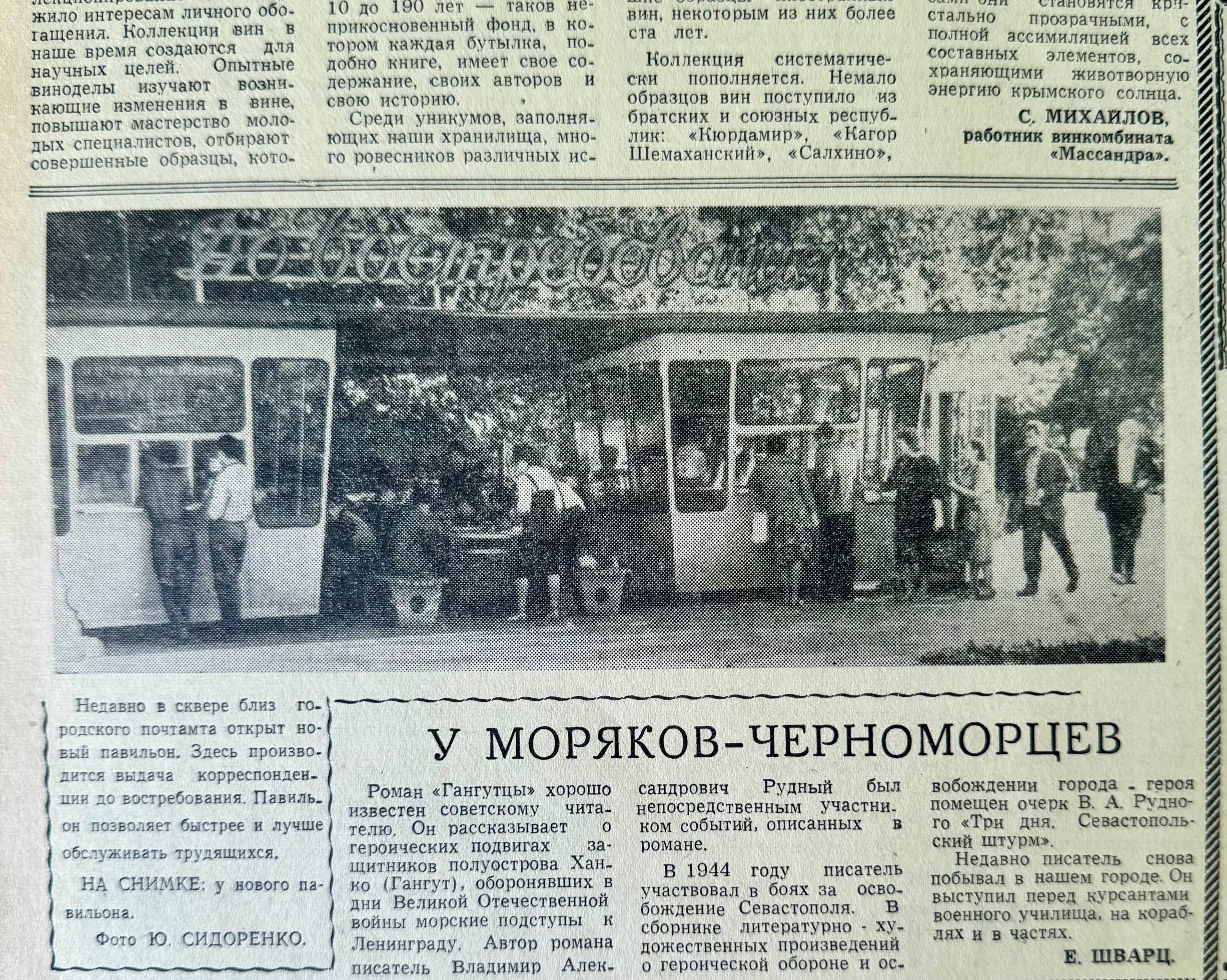 Вырезка из газеты «Слава Севастополя» об открытии нового павильона в сквере возле городского почтамта, осень 1964 года