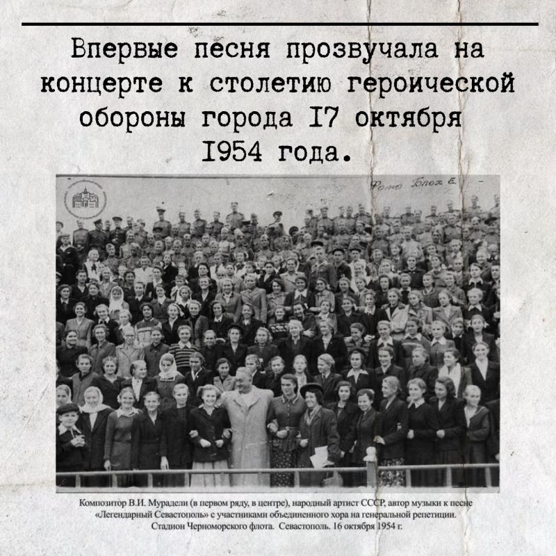 Песню «Легендарный Севастополь» композитор Вано Мурадели и поэт Пётр Градов написали к 100-летию Первой обороны города. Впервые она прозвучала на концерте к юбилею этого события.