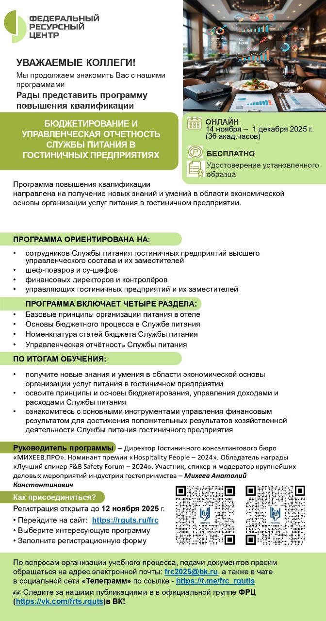 ФРЦ на базе РГУТИС предлагает программы повышения квалификации и профессиональной переподготовки:
