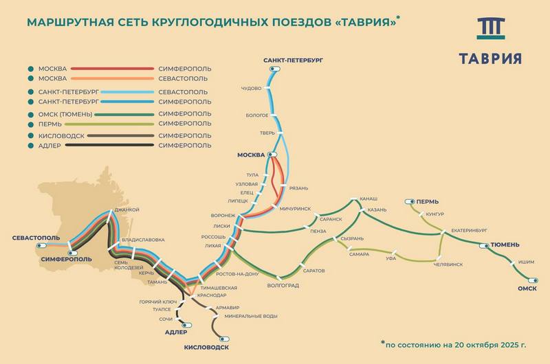 В Крым будут ходить 10 круглогодичных поездов: четыре ежедневных из Москвы (включая фирменный «Таврия Экспресс»), два ежедневных из Санкт-Петербурга и четыре поезда из других регионов (Адлер, Кисловодск, Омск/Тюмень, Пермь).