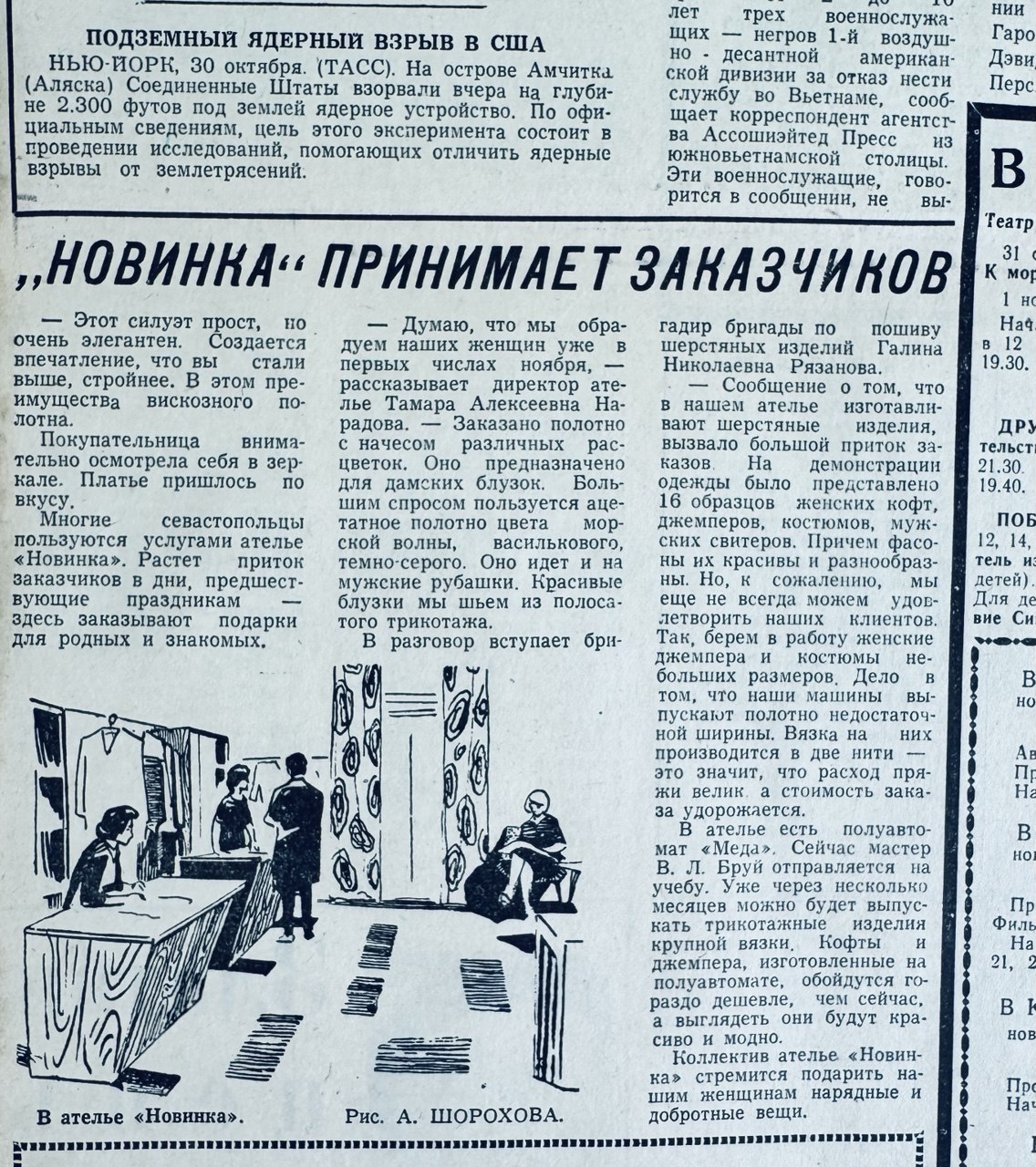 «Многие севастопольцы пользуются услугами ателье „Новинка”. Растёт приток заказчиков в дни, предшествующие праздникам — здесь заказывают подарки для родных и знакомых», — писали в газете.