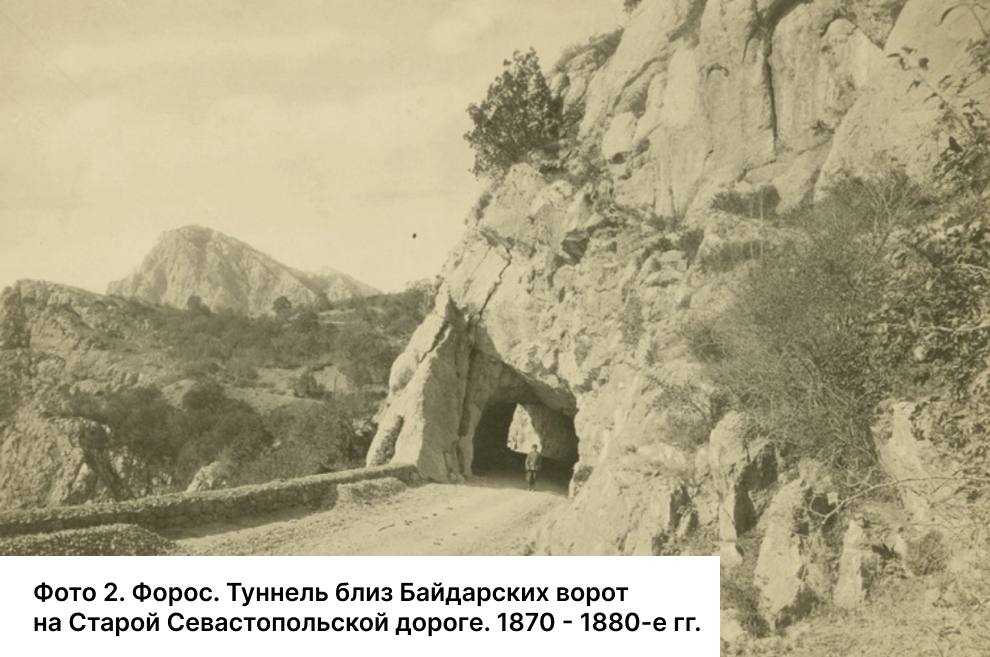 На фото 1870-1880-х гг. — инженерный шедевр своего времени. При строительстве дороги Севастополь-Ялта в 1837-1848 гг. на 40-й версте от Севастополя, примерно в трех верстах ниже перевала Байдарские ворота, в монолитной скале, был пробит дорожный тоннель. Представьте, каково было ехать в экипаже по дороге, нависающей над 400-метровой пропастью, и въезжать в эту темную арку!