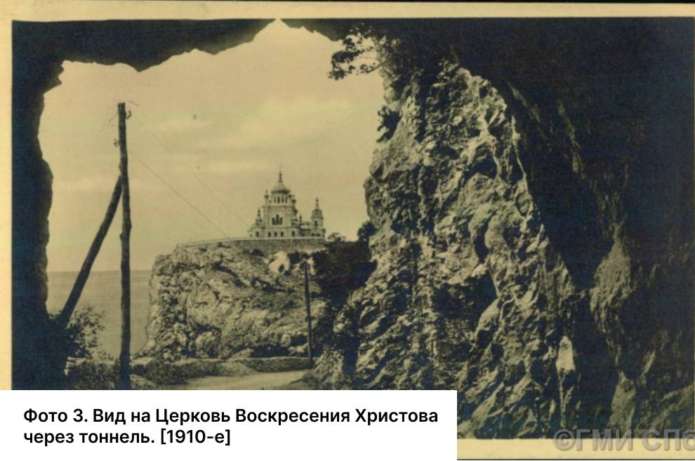 На фото 1910-х гг. тот же тоннель, но его проем превратился в «рамку» для нового символа — Форосской церкви.Храм Воскресения Христова на Красной скале построили в 1892 году в честь чудесного спасения семьи государя-императора Александра III после крушения поезда 17 октября 1888 года.