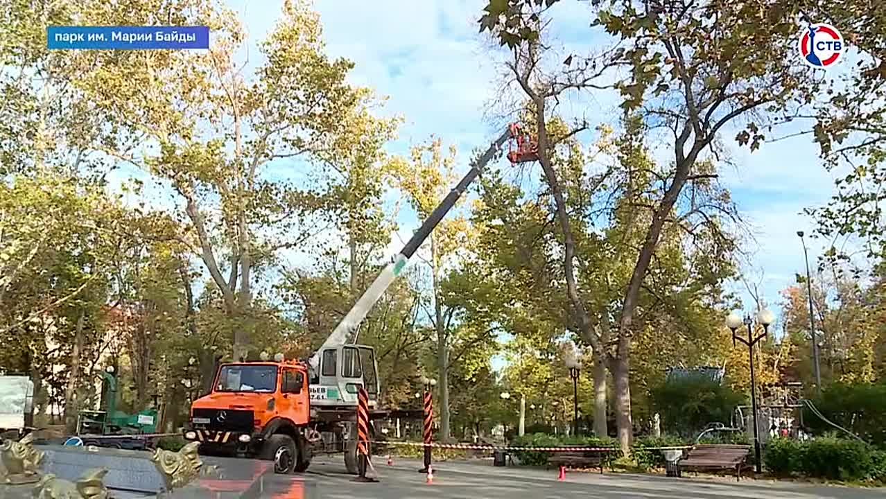 Муниципалитеты, управляющие компании и Парки и скверы активно готовятся к сезону ветеров Севастополе. Эффективно убирать сухие ветки помогает специальное оборудование, среди которого кран-вышка.