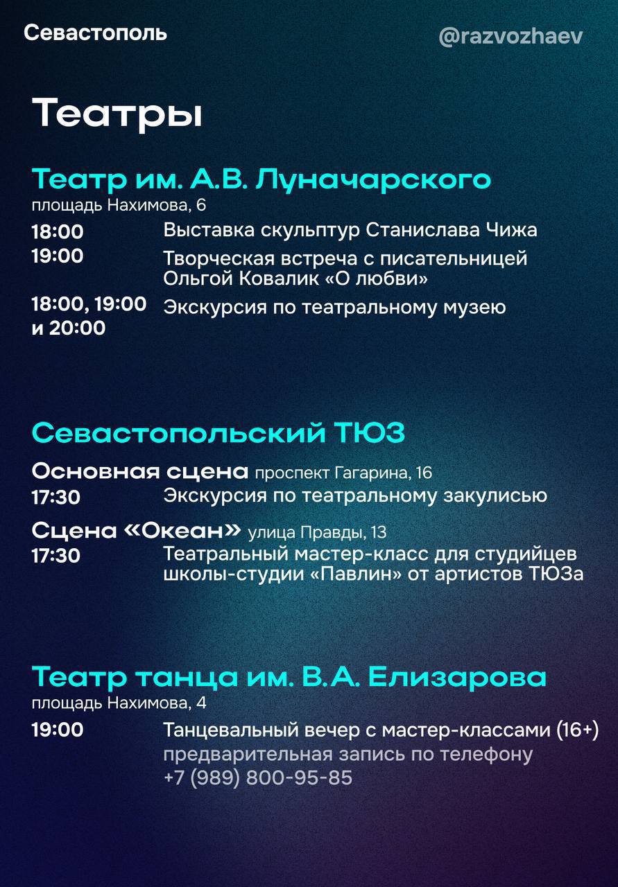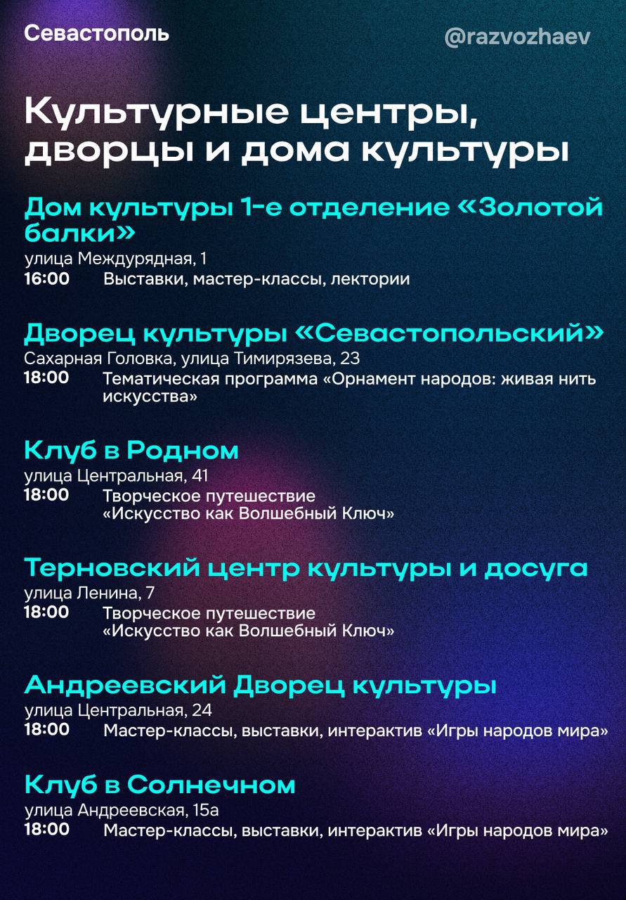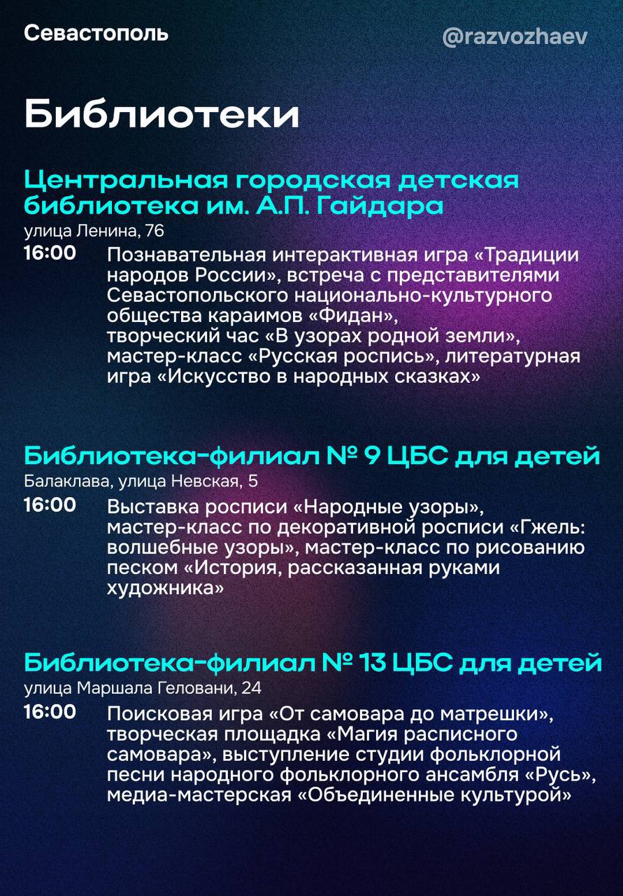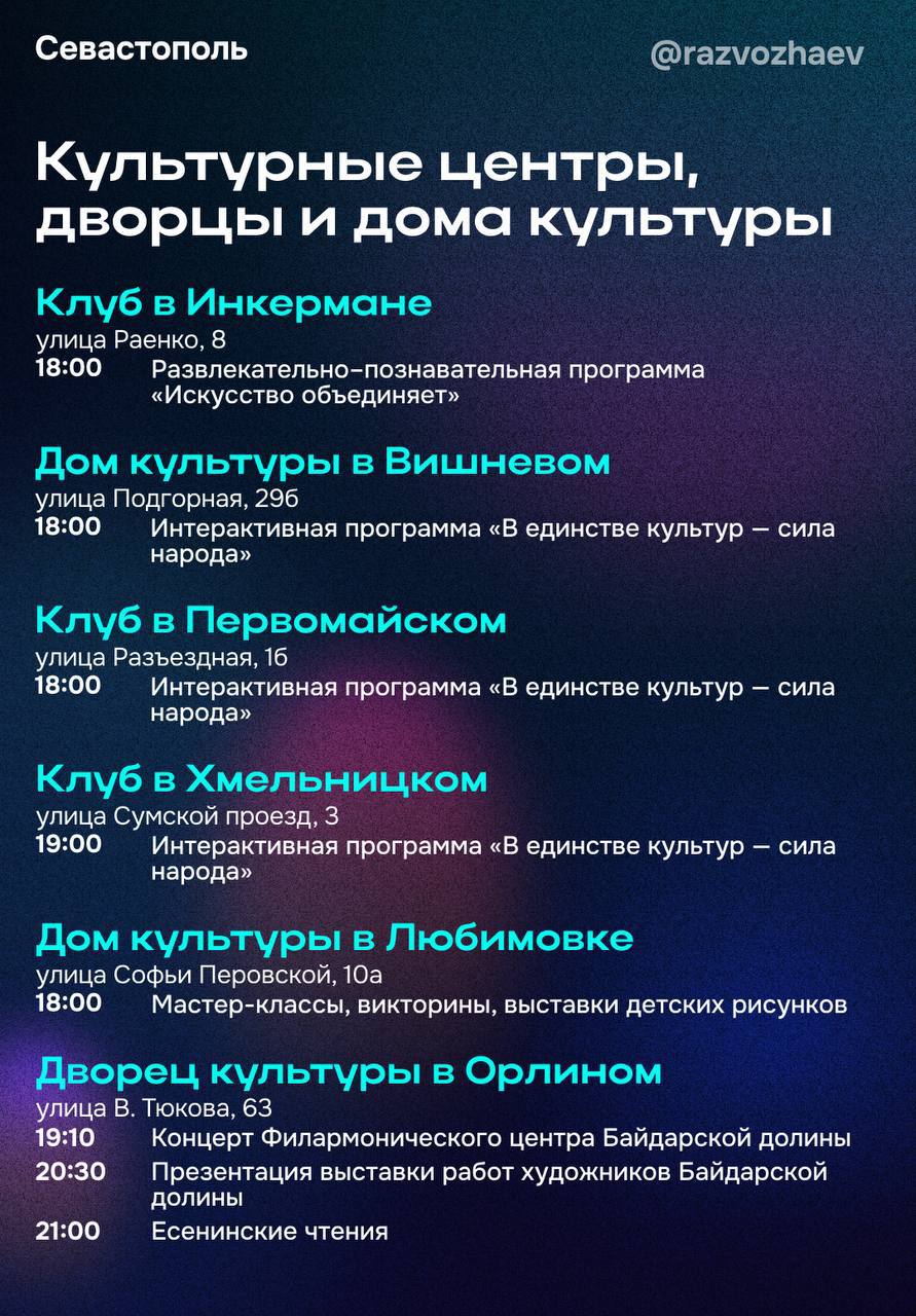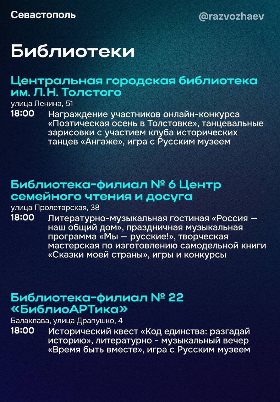 «В музее-заповеднике «Херсонес Таврический» проведут тематические мастер-классы, будет работать выставка картин и интерактивная площадка, а в завершении дня желающие смогут насладиться красотой вечернего древнего города. В Музее Крыма и Новороссии музейно-храмовый комплекс «Новый Херсонес» представит иммерсивную экскурсию «Мудрость предков». Гости комплекса смогут погрузиться в страницы отечественной истории и стать её героями: примерить доспехи русского дружинника, произнести клятву жителя Херсонеса, научиться вязать морские узлы и оставить своё послание для России будущего. Обратите внимание, эта экскурсия — эксклюзив акции и в другие даты проводиться не будет», — подчеркнул губернатор Севастополя Михаил Развожаев.