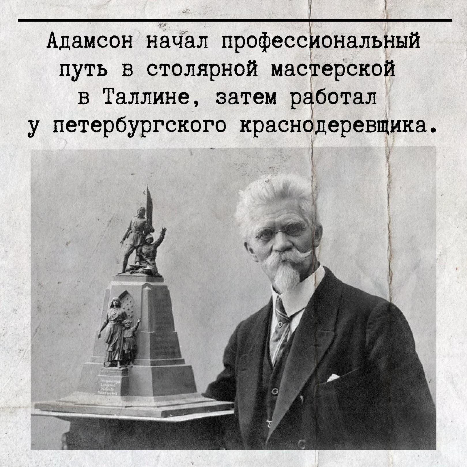 Адамсон делал на заказ декоративные украшения, столовые приборы из воска, статуэтки из слоновой кости, мраморные бюсты. В начале XX века он стал заниматься монументальной пластикой. Первая его работа в этом направлении — памятник морякам русского броненосца «Русалка» в Таллине.