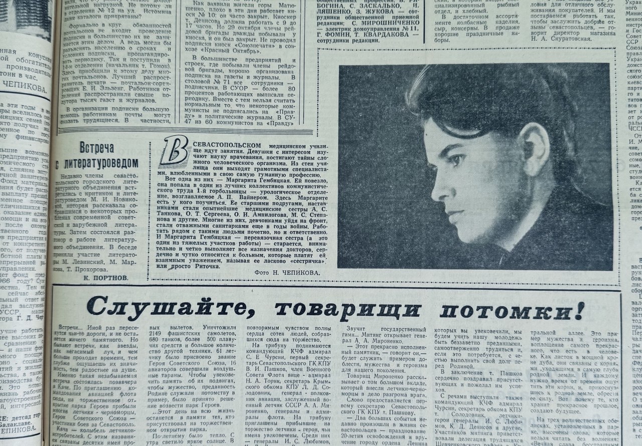 «В Севастопольском медицинском училище идут занятия. Девушки с интересом изучают науку врачевания, постигают тайны сложного человеческого организма. Из стен училища они выходят грамотными специалистами, влюблёнными в свою самую гуманную профессию.Вот одна из них — Маргарита Гембицкая. Ей повезло, она попала в один из лучших коллективов коммунистического труда — 1-й горбольницы, урологическое отделение, возглавляемое А. П. Вайнером», — писали в газете.