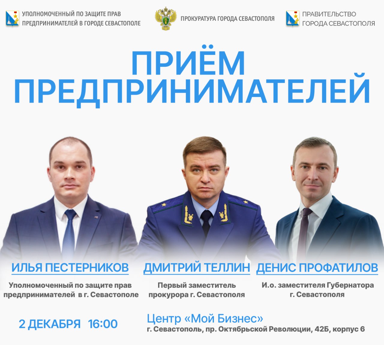 2 декабря первый заместитель прокурора города Севастополя Дмитрий Теллин при участии и.о. заместителя Губернатора Севастополя Дениса Профатилова, Уполномоченного по защите прав предпринимателей Ильи Пестерникова проведёт личный приём представителей бизнеса.