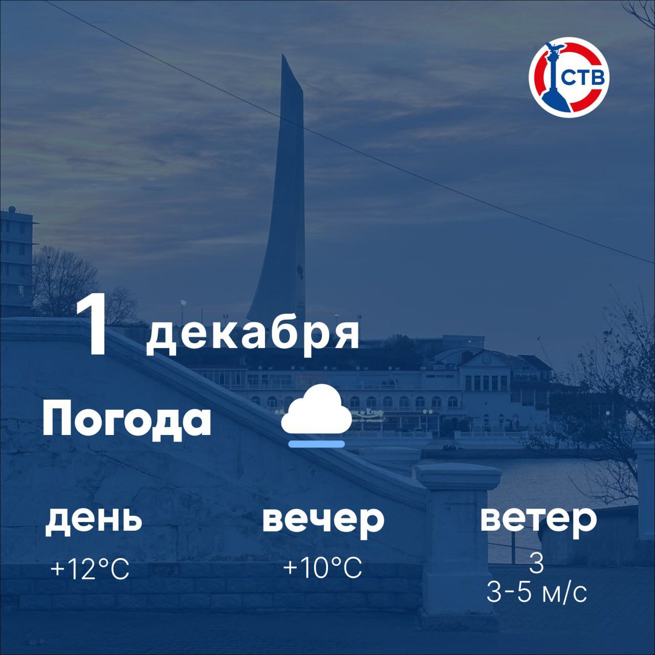 Погода на 1 декабря:• переменная облачность• температура воздуха: +12°• атмосферное давление: 763 мм рт.ст.• ветер западный до 4 м/сЛегендарный 24 | Севастополь