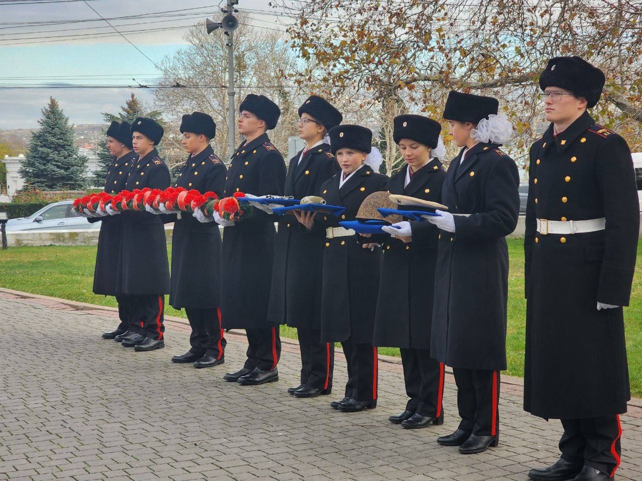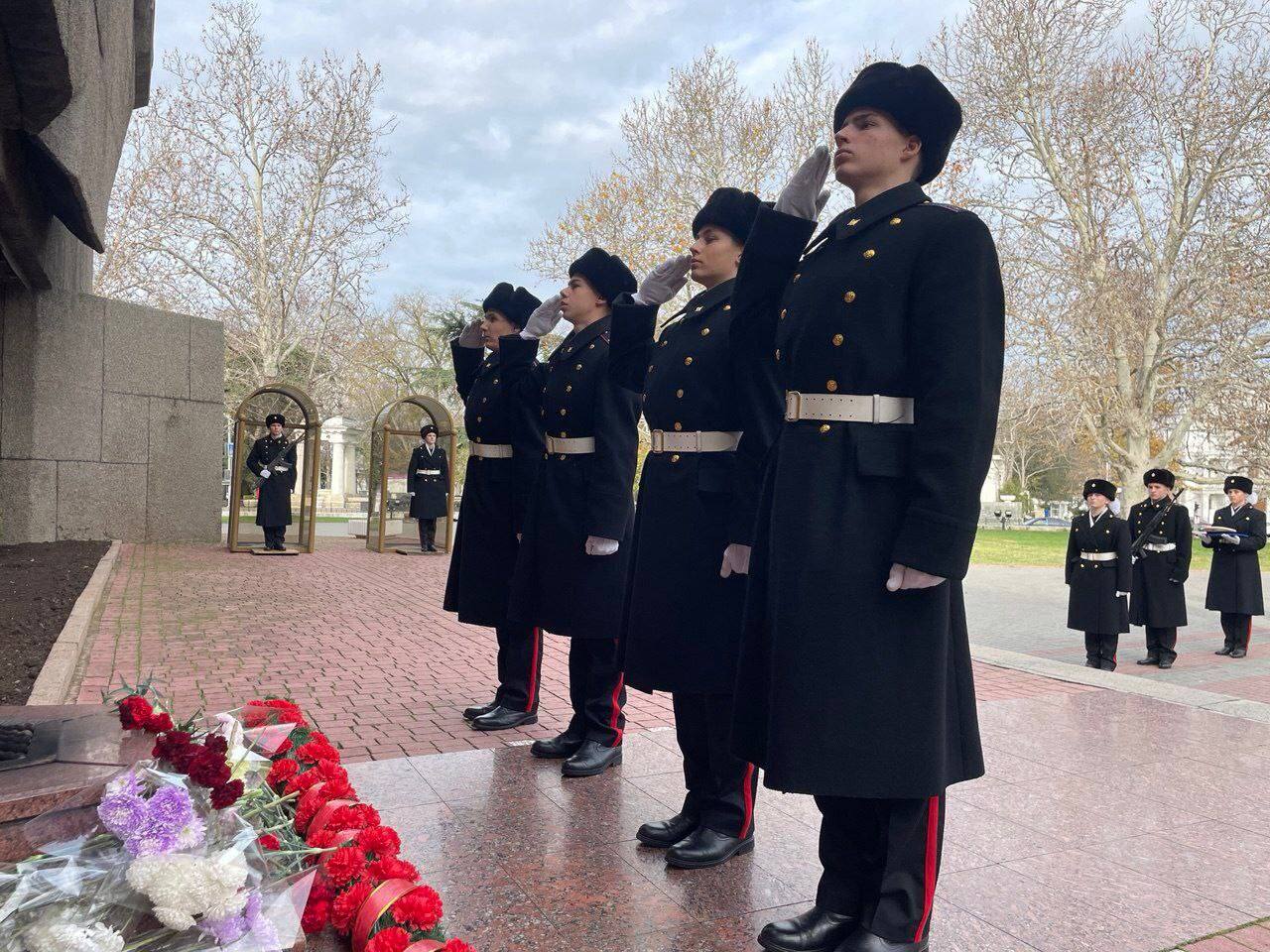 Юнармейцы отряда Почётного караула Севастопольского кадетского корпуса Следственного комитета РФ имени В.И. Истомина торжественно вынесли к Вечному огню Мемориальной стены реликвии Великой Отечественной войны, а также возложили памятную гирлянду.