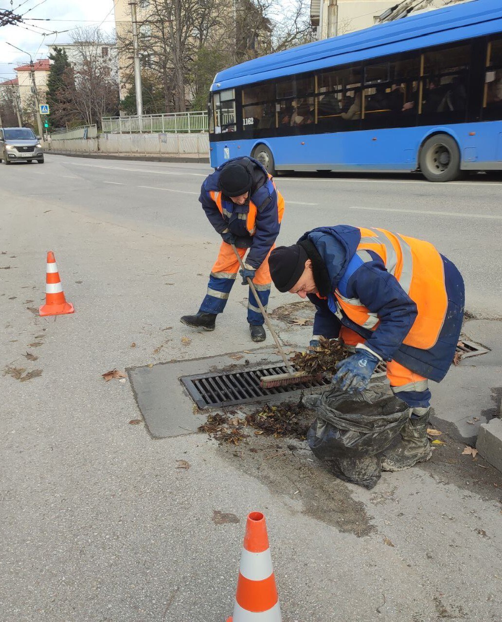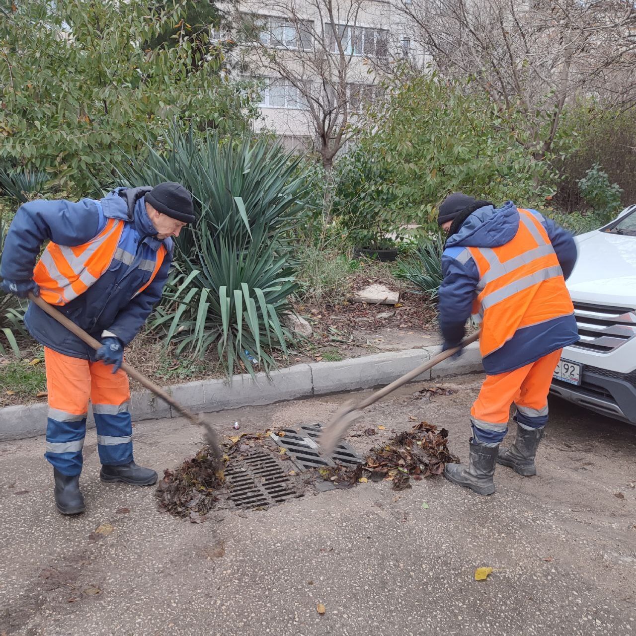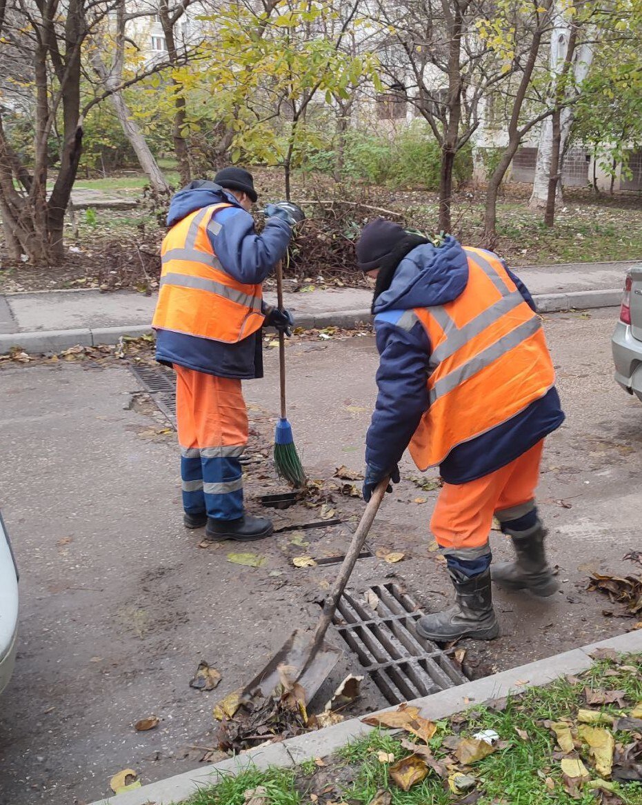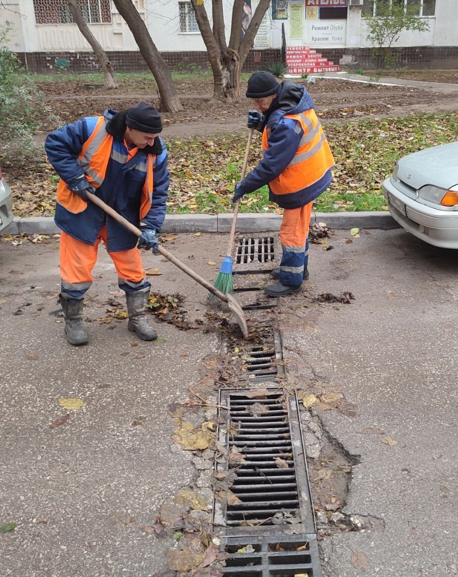 На фото Николая Ерёмина: бригада службы ливневой канализации очищает ливневые решетки и лотки от листьев на ул. Ленина, ул. Генерала Петрова, ул. Сенявина, ул. Гоголя, ПОР