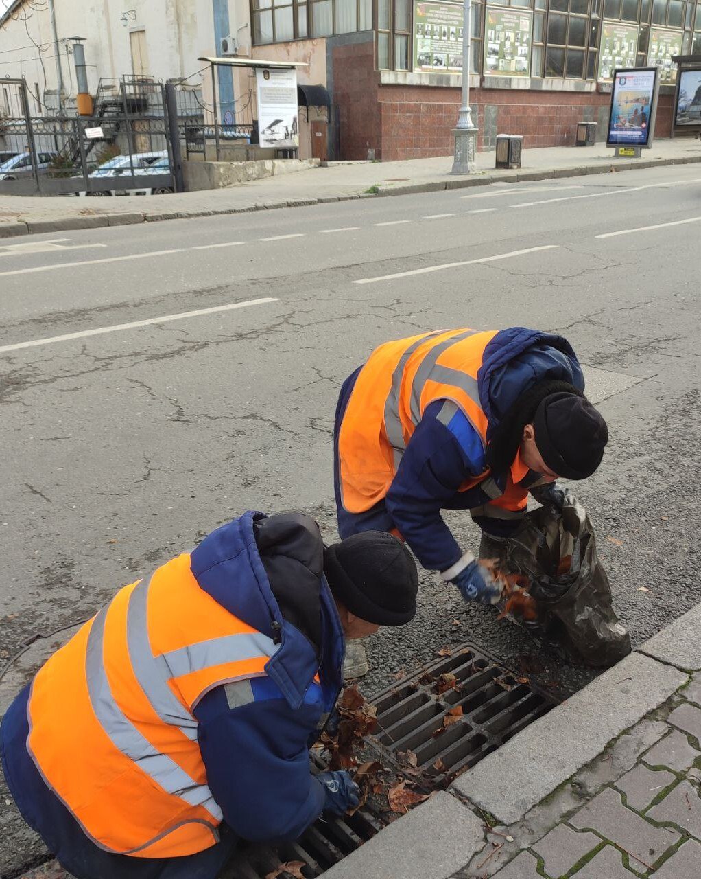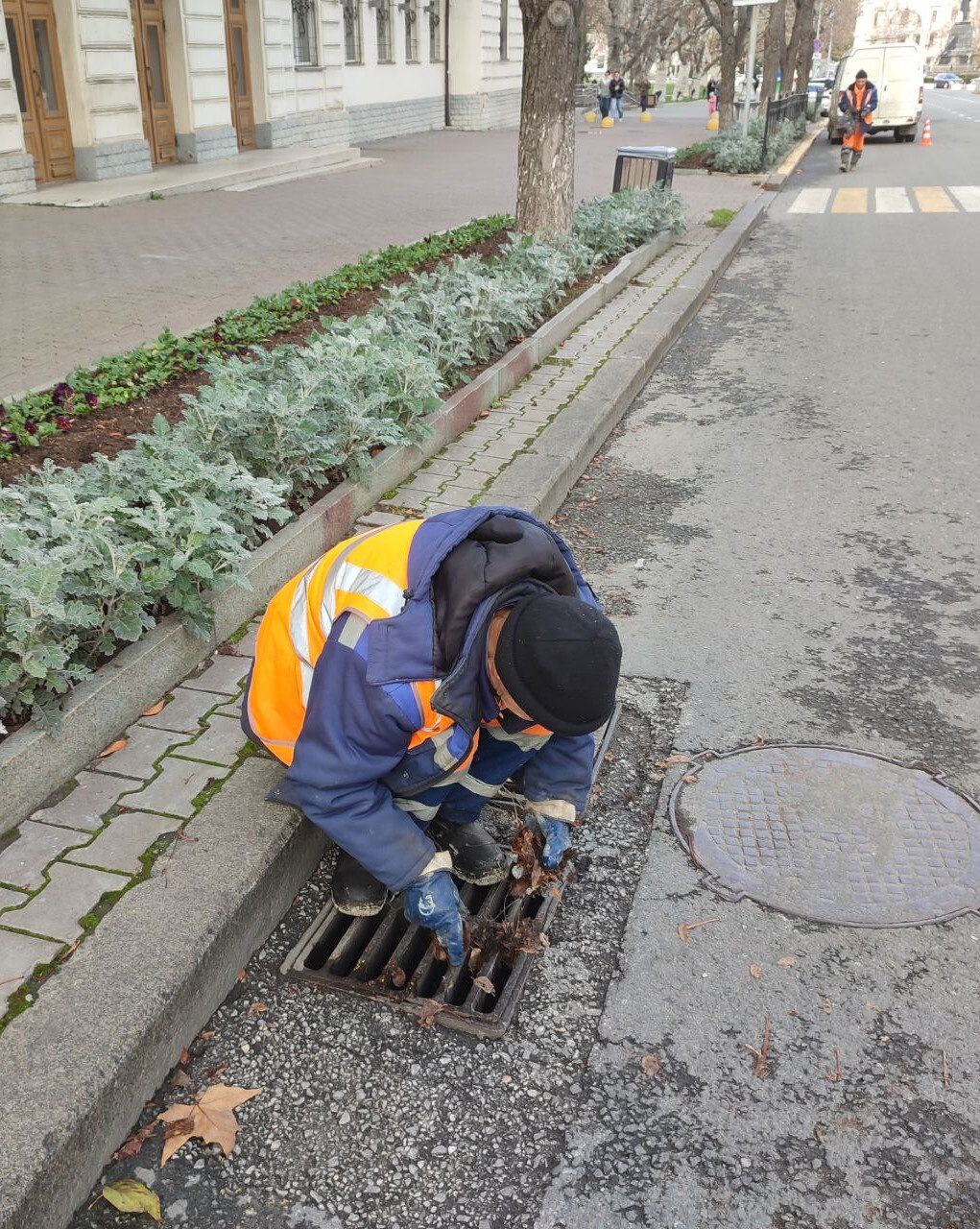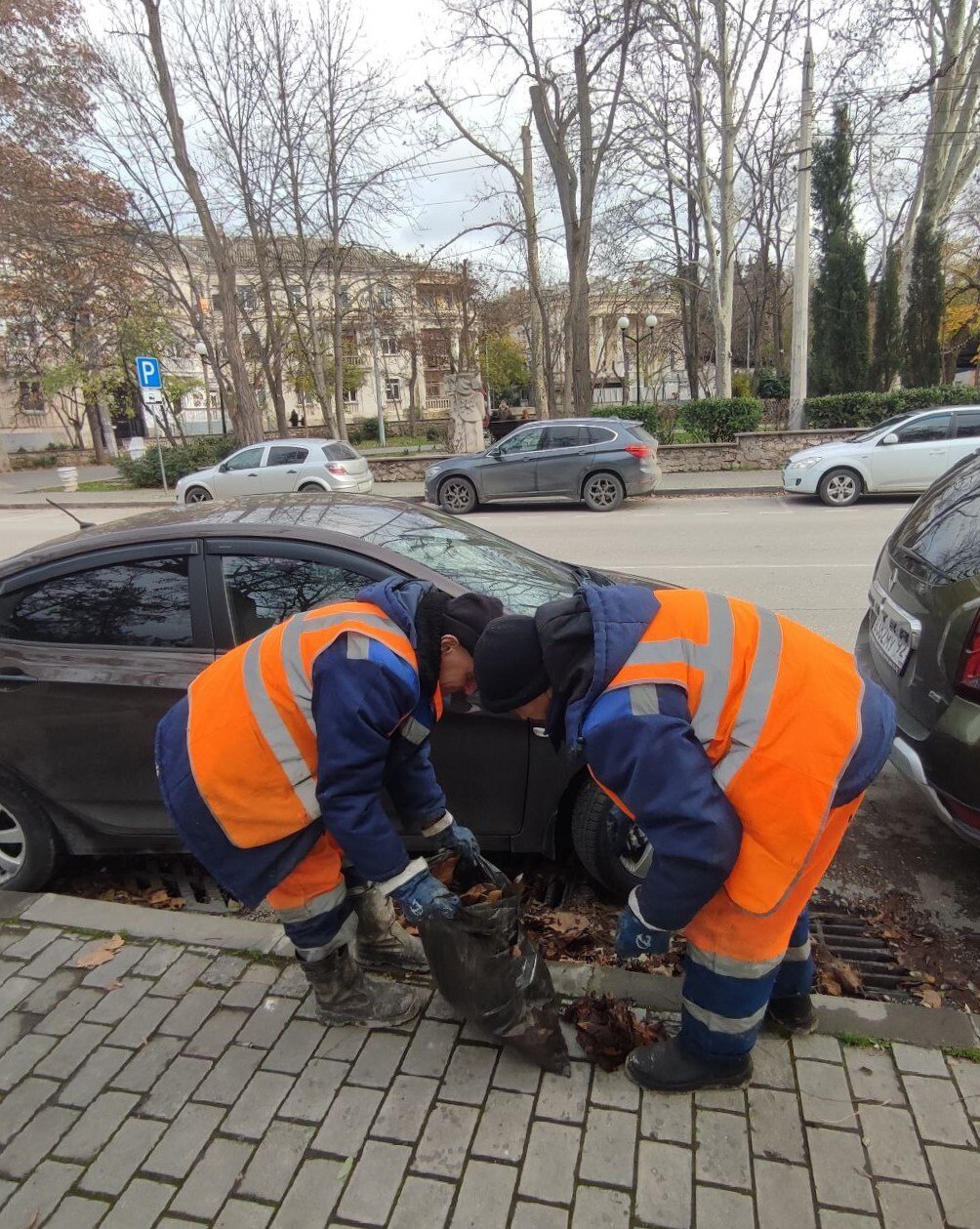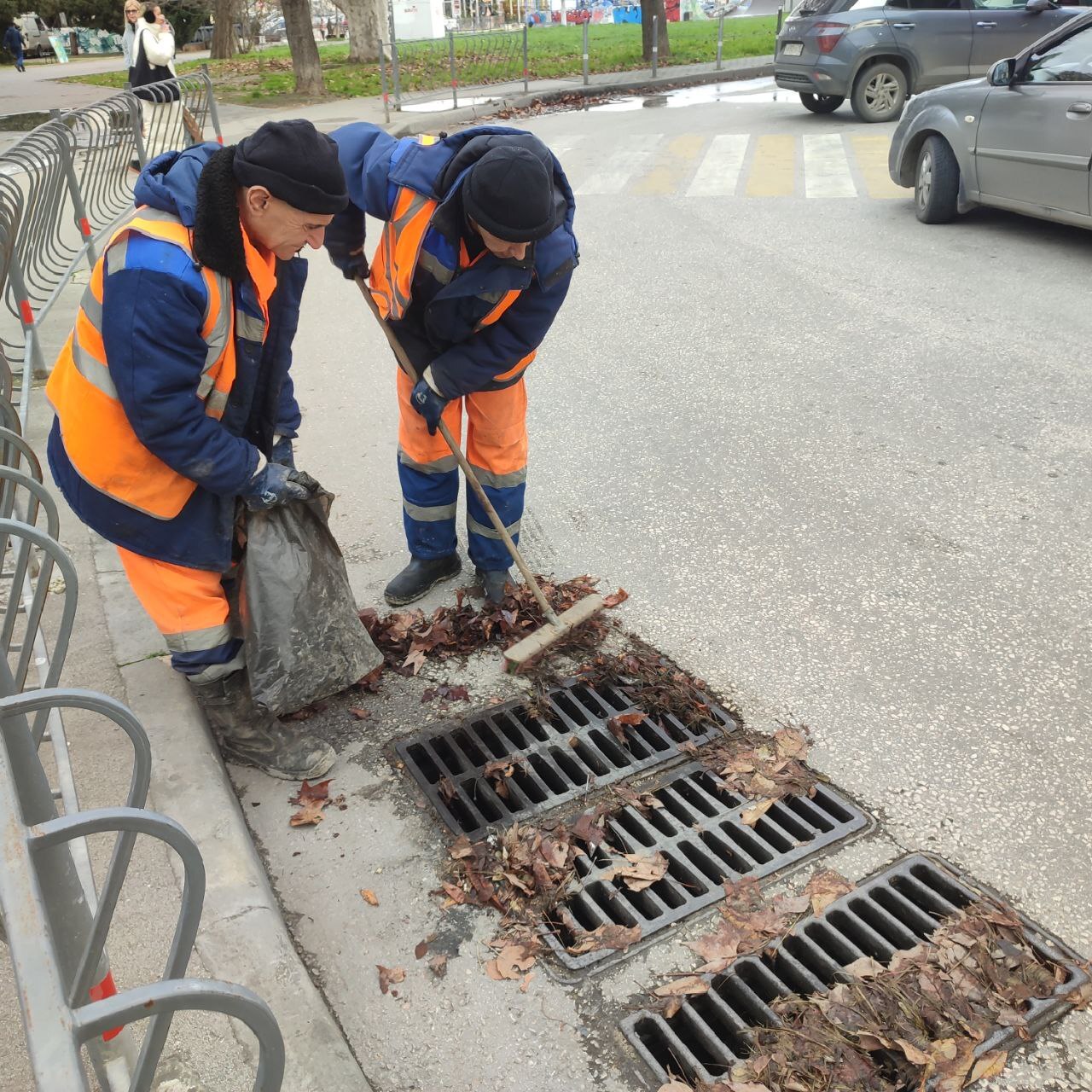 На фото Николая Ерёмина: бригада службы ливневой канализации очищает ливневые решетки и лотки от листьев на ул. Ленина, ул. Генерала Петрова, ул. Сенявина, ул. Гоголя, ПОР