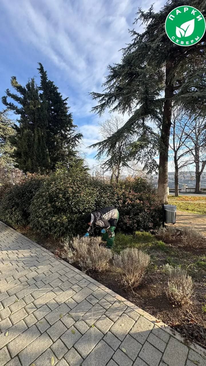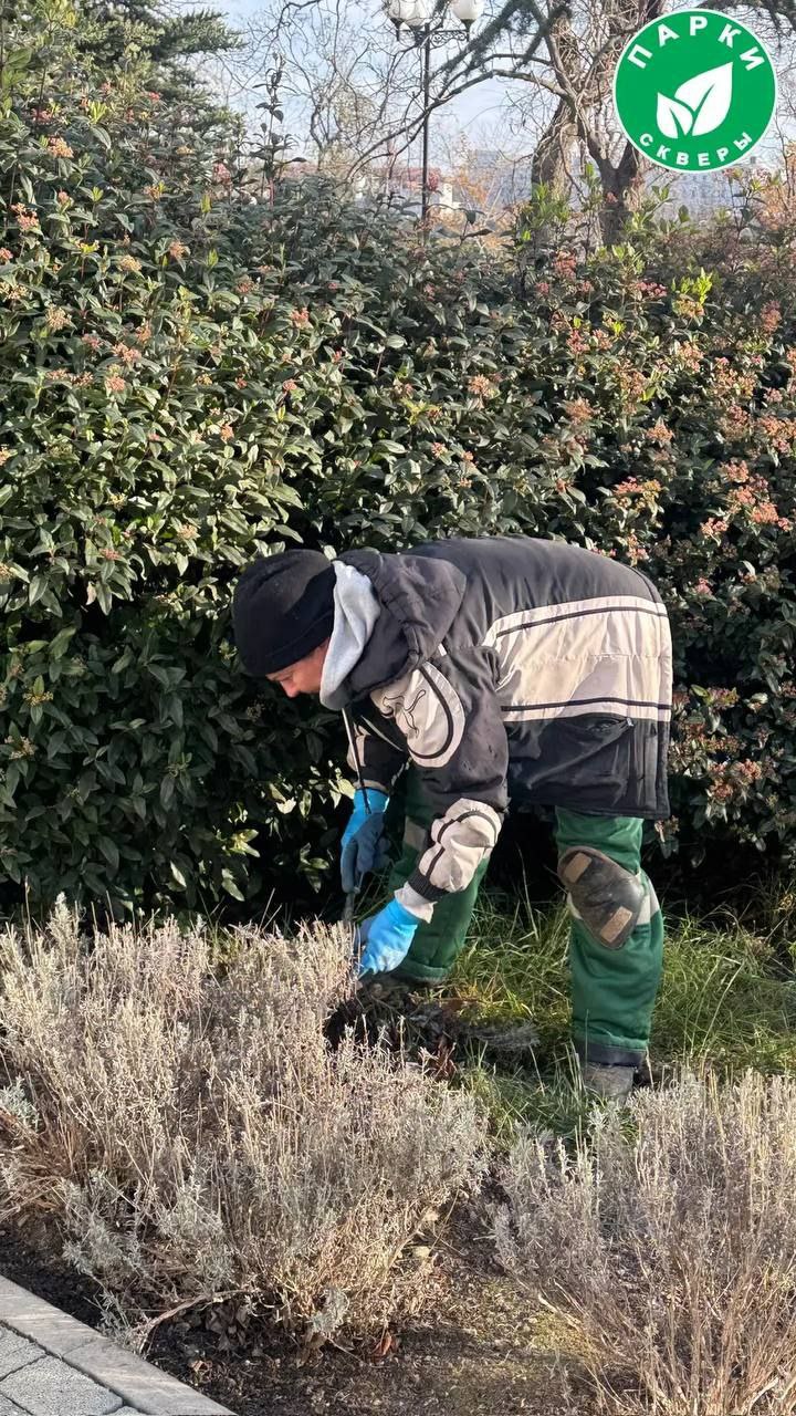 Рабочие очистили газоны от сухой листвы и удалили поросль кустарников и деревьев. Эти меры помогают защитить растения от вредителей и болезней, а также обеспечивают доступ света и воздуха к их корням.