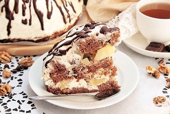 После этого в оставшуюся часть крема добавляются кубики бисквита. Все тщательно перемешивается до равномерного распределения составных частей. Данный бисквитный торт собирается в несколько слоев. На плоском блюде выкладываются коржи, следуя простой логике: сначала корж, затем кусочки ананаса и орехи, немного крема, и так повторять до тех пор, пока не закончатся все ингредиенты. Важно собирать торт в виде пирамиды для счастья!
