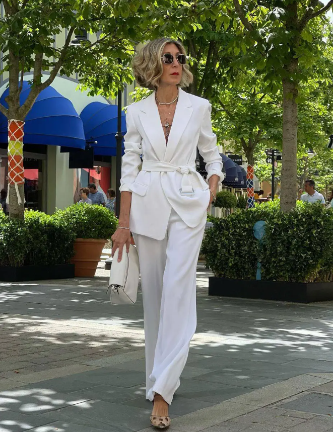 - Белый цвет как символ свежести. Белая одежда делает образы более легкими и современными. Например, белый брючный костюм может стать универсальным вариантом для любых случаев — от повседневных встреч до деловых мероприятий. Образы должны быть свободными и комфортными, уходите от обтягивающих вещей.