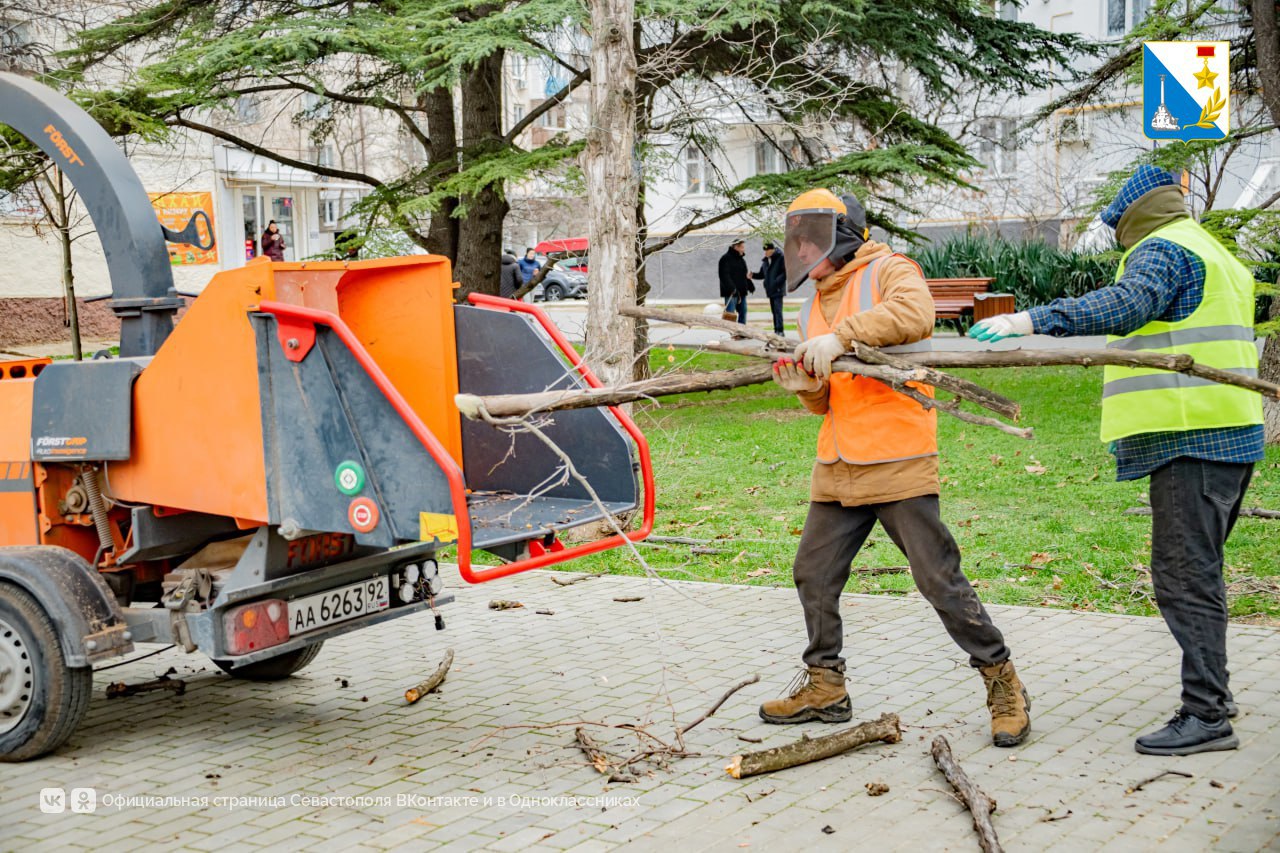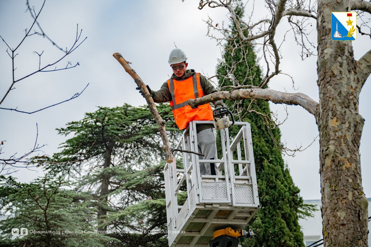 На кадрах — обрезка сухих ветвей у семи платанов в сквере на проспекте Генерала Острякова.