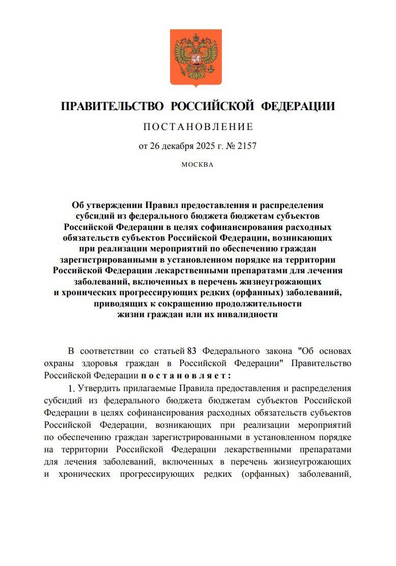 С 2026 года регионы смогут получать федеральные средства на закупку дорогостоящих препаратов для пациентов с орфанными заболеваниями. Подписано постановление, утверждающее правила предоставления субсидий на эти цели.