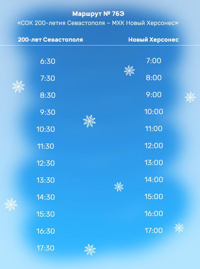 Кроме того, 18 января будет работать бесплатный экспресс-маршрут от СОК имени 200-летия Севастополя (с промежуточной остановкой на площади 50-летия СССР) до Херсонеса. Они будут ходить 1 раз в час с 06:30 до 17:30.