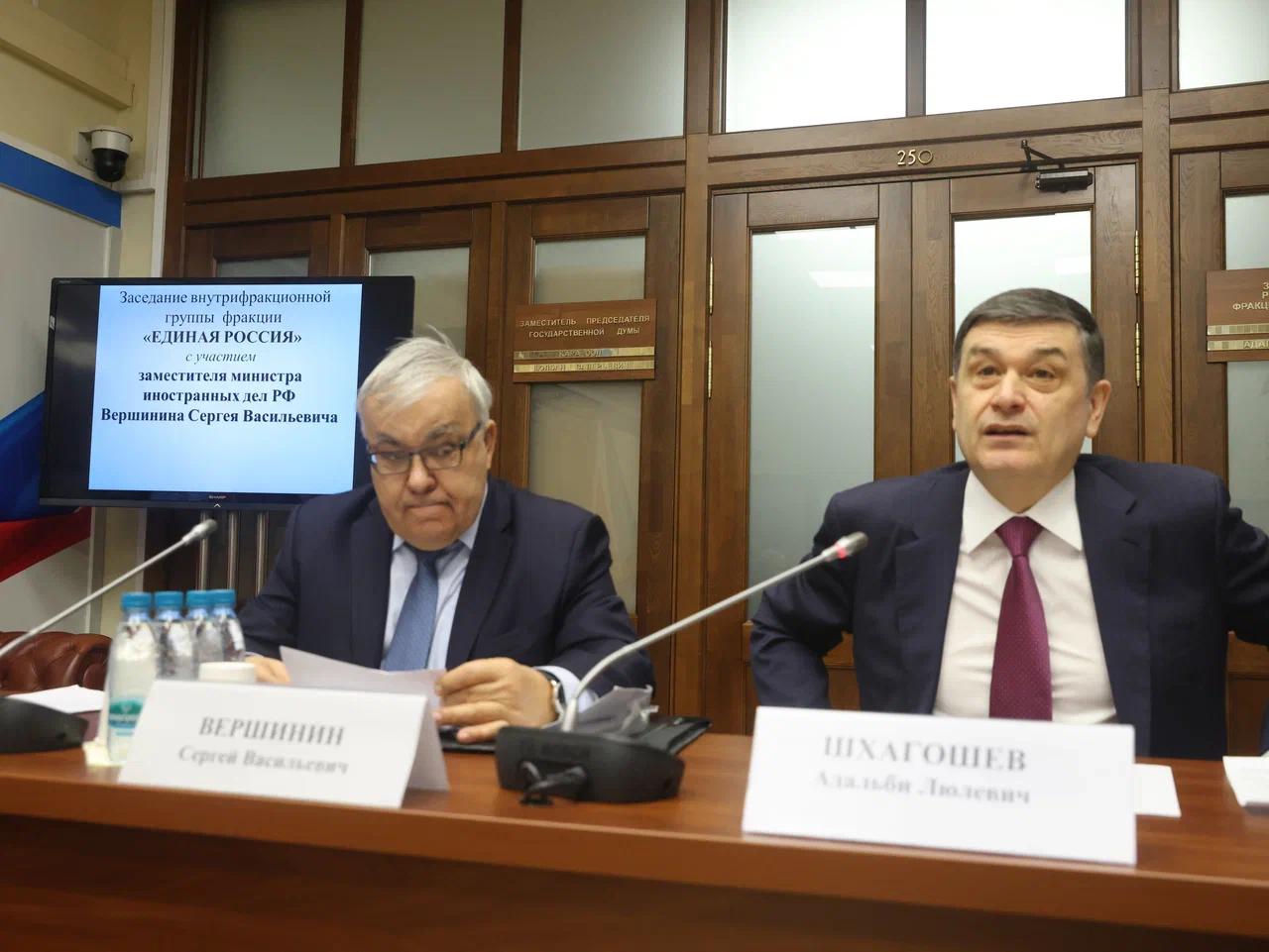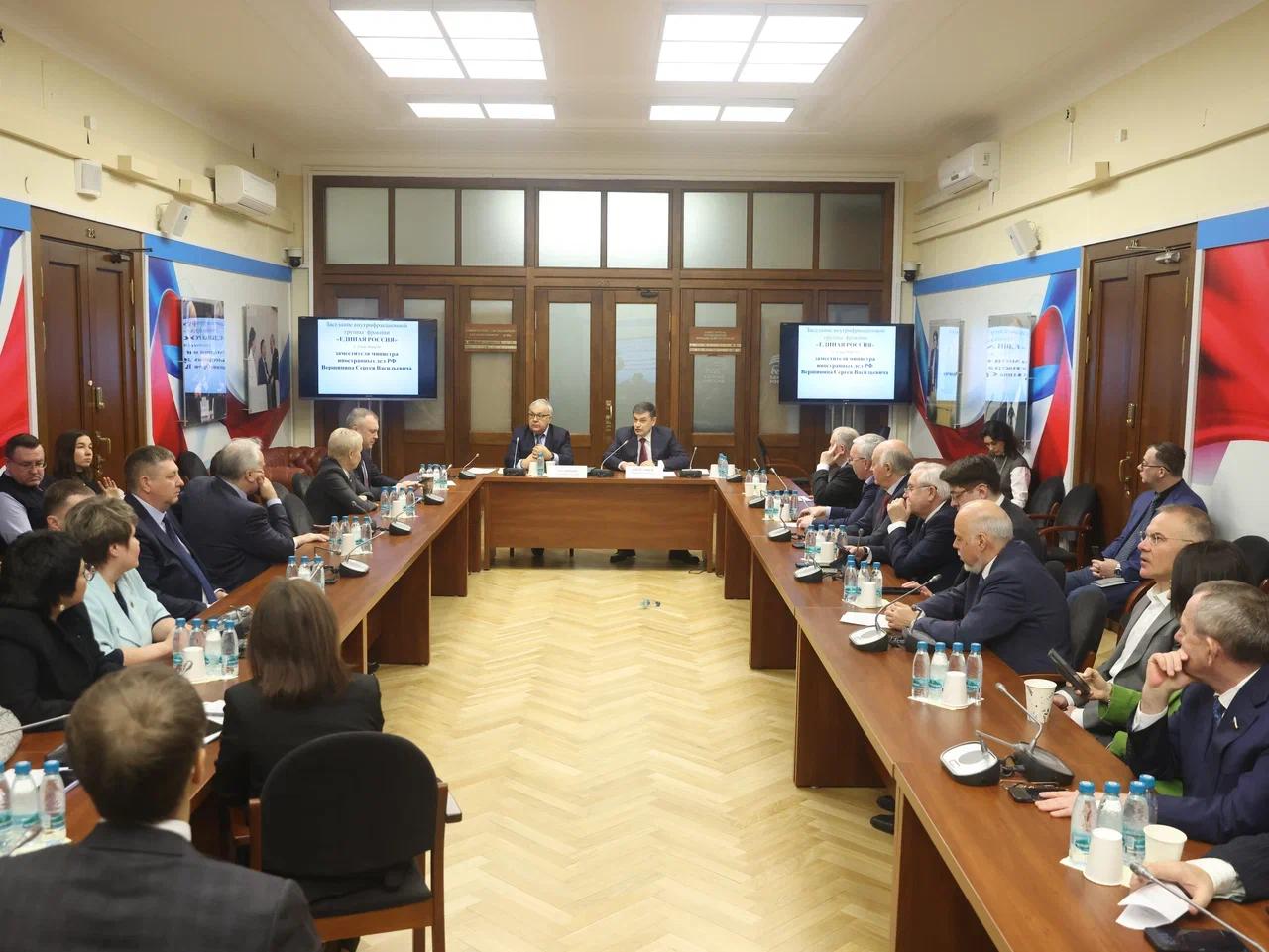 На заседании внутрифракционной группы с участием заместителя Министра иностранных дел Российской Федерации Сергея Вершинина обсудили актуальную международную обстановку и приоритетные направления внешней политики страны.