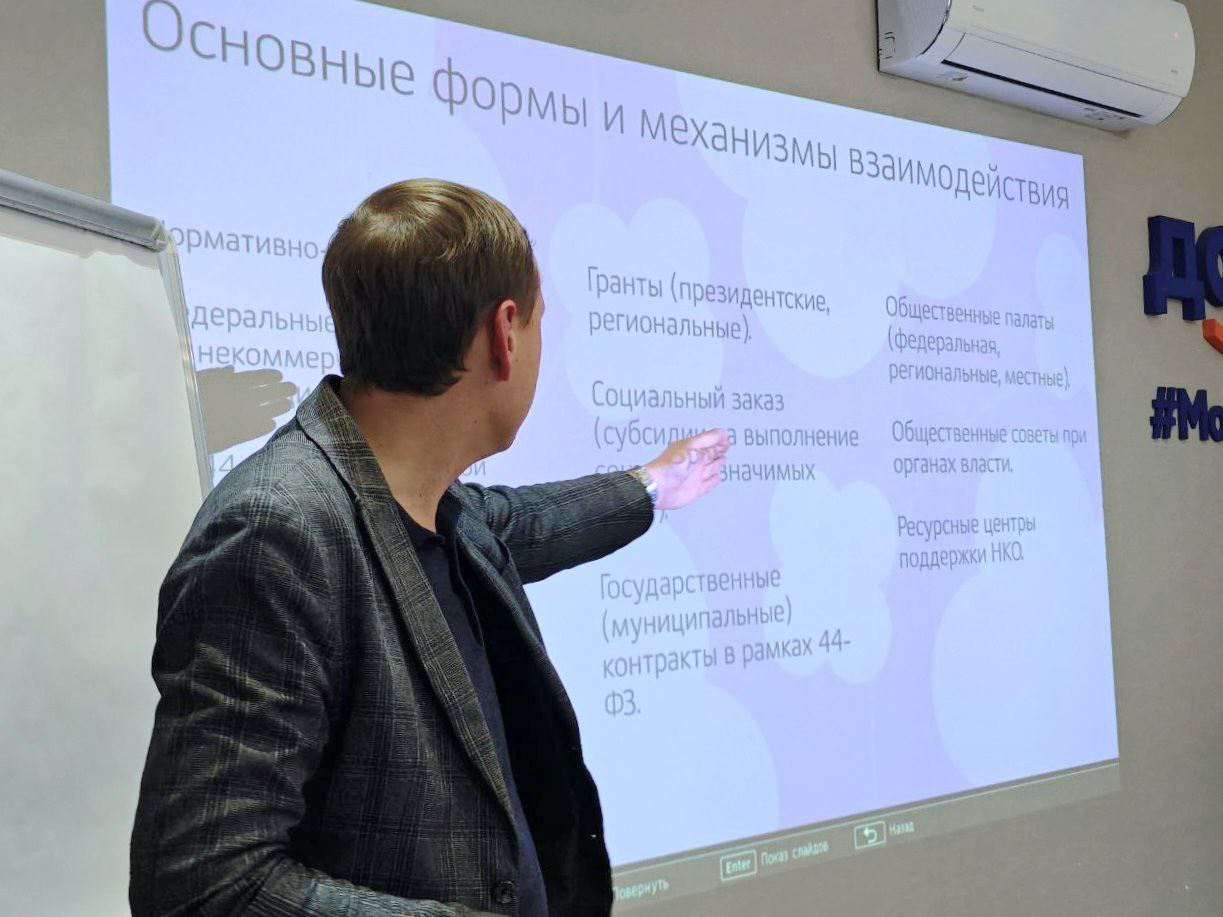 Тема — взаимодействие органов государственной власти с НКО. Спикером выступил Юрий Сурков, заместитель начальника управления общественных проектов департамента внутренней политики.