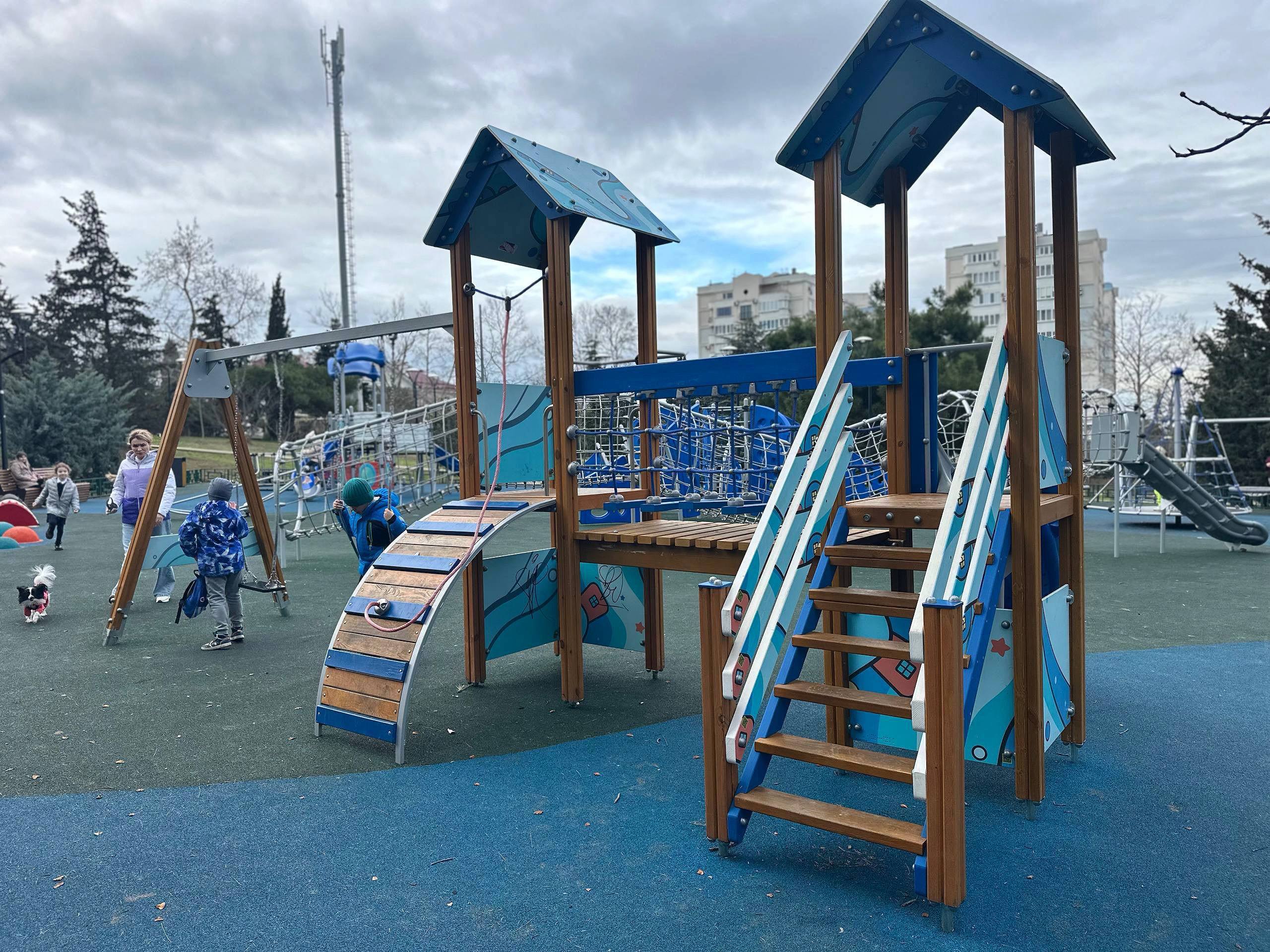 Установлены детские городки, игровой комплекс, карусель, качели, гибкие элементы для лазания, парковые скамьи, урны и яркие фигуры из резиновой крошки, которые, по словам родителей, особенно понравились ребятам.