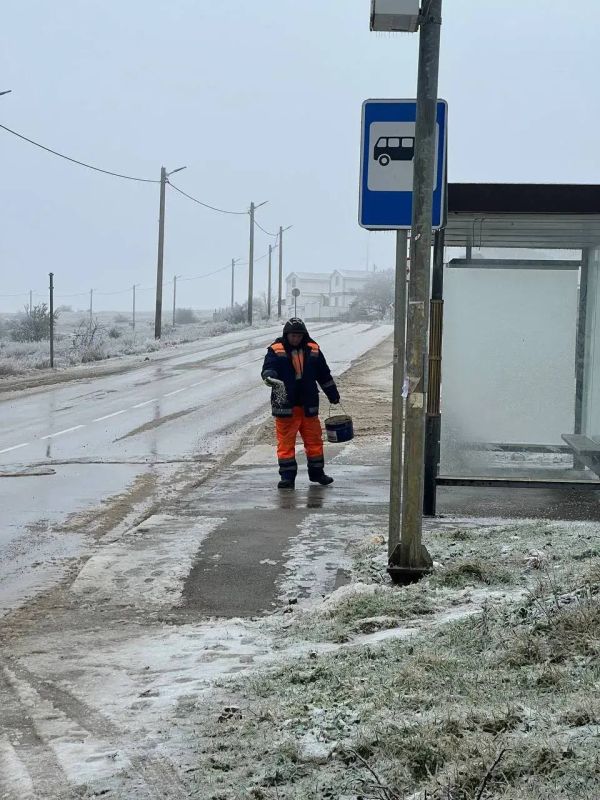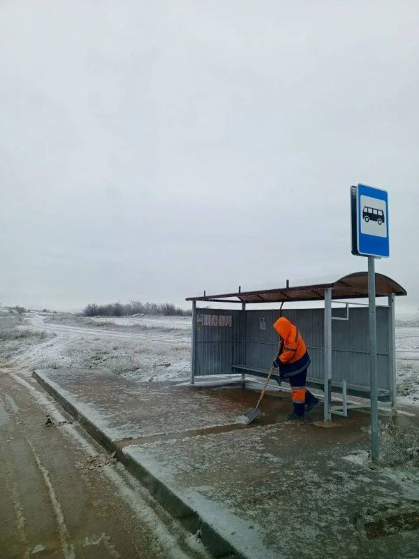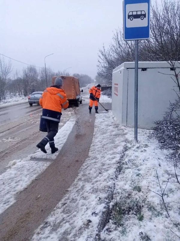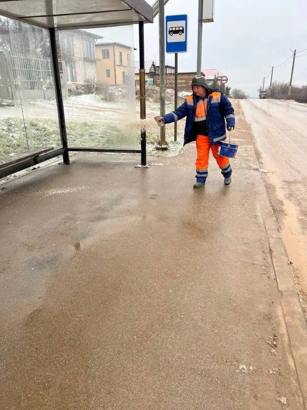 Первостепенно были обработаны пешеходные зоны дорог, опасные участки, дороги вблизи социальных объектов. Остановочные павильоны бригады Севавтодора продолжают расчищать вручную.