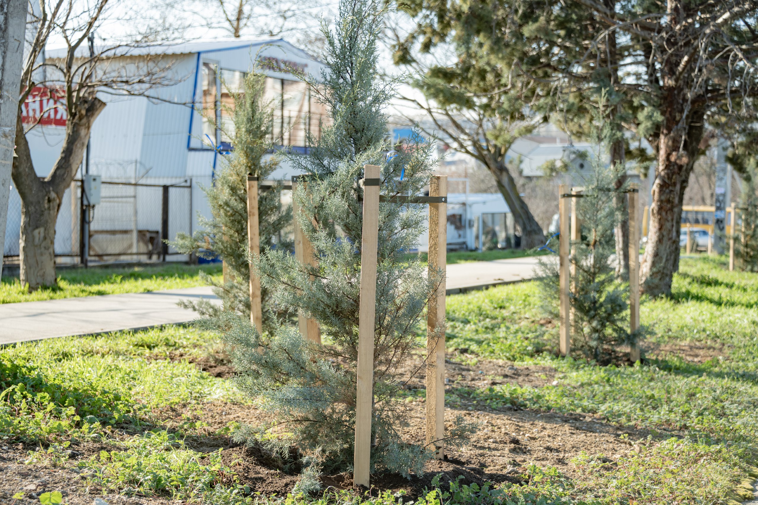 Все деревья для сохранения устойчивости подвязали, а на стволы установили защиту от механических повреждений.