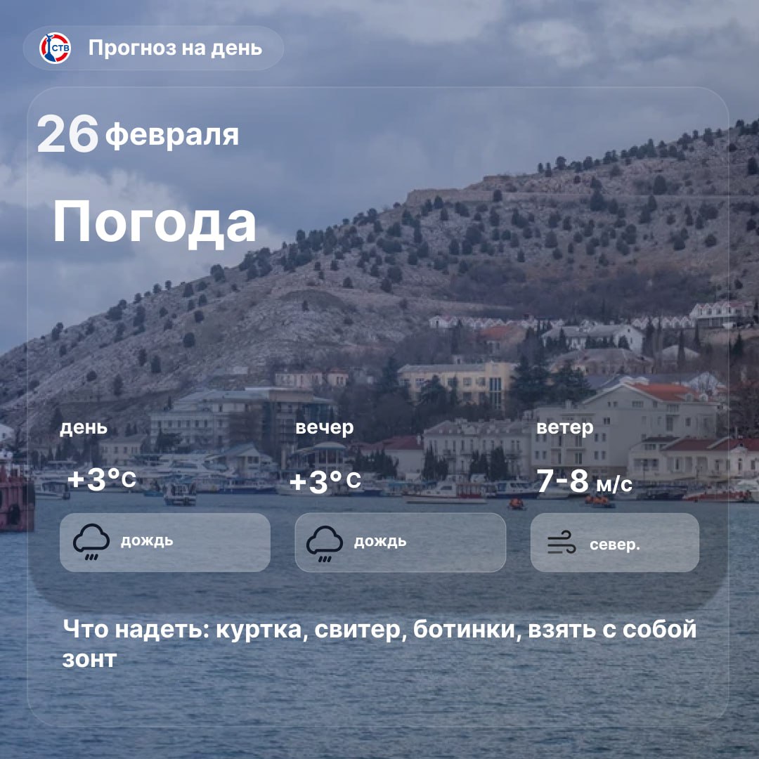Доброе утро, севастопольцы! Сегодня днём в городе прохладно — около +3°C и дождь. Пусть даже пасмурная погода не испортит вам настроение.