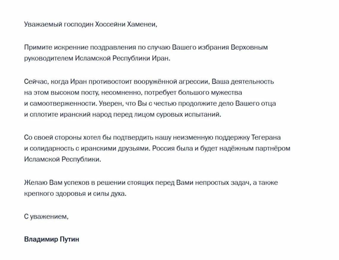 Сейчас, когда Иран противостоит вооружённой агрессии, Ваша деятельность на этом высоком посту, несомненно, потребует большого мужества и самоотверженности. Уверен, что Вы с честью продолжите дело Вашего отца и сплотите иранский народ перед лицом суровых испытаний.Со своей стороны хотел бы подтвердить нашу неизменную поддержку Тегерана и солидарность с иранскими друзьями. Россия была и будет надёжным партнёром Исламской Республики.