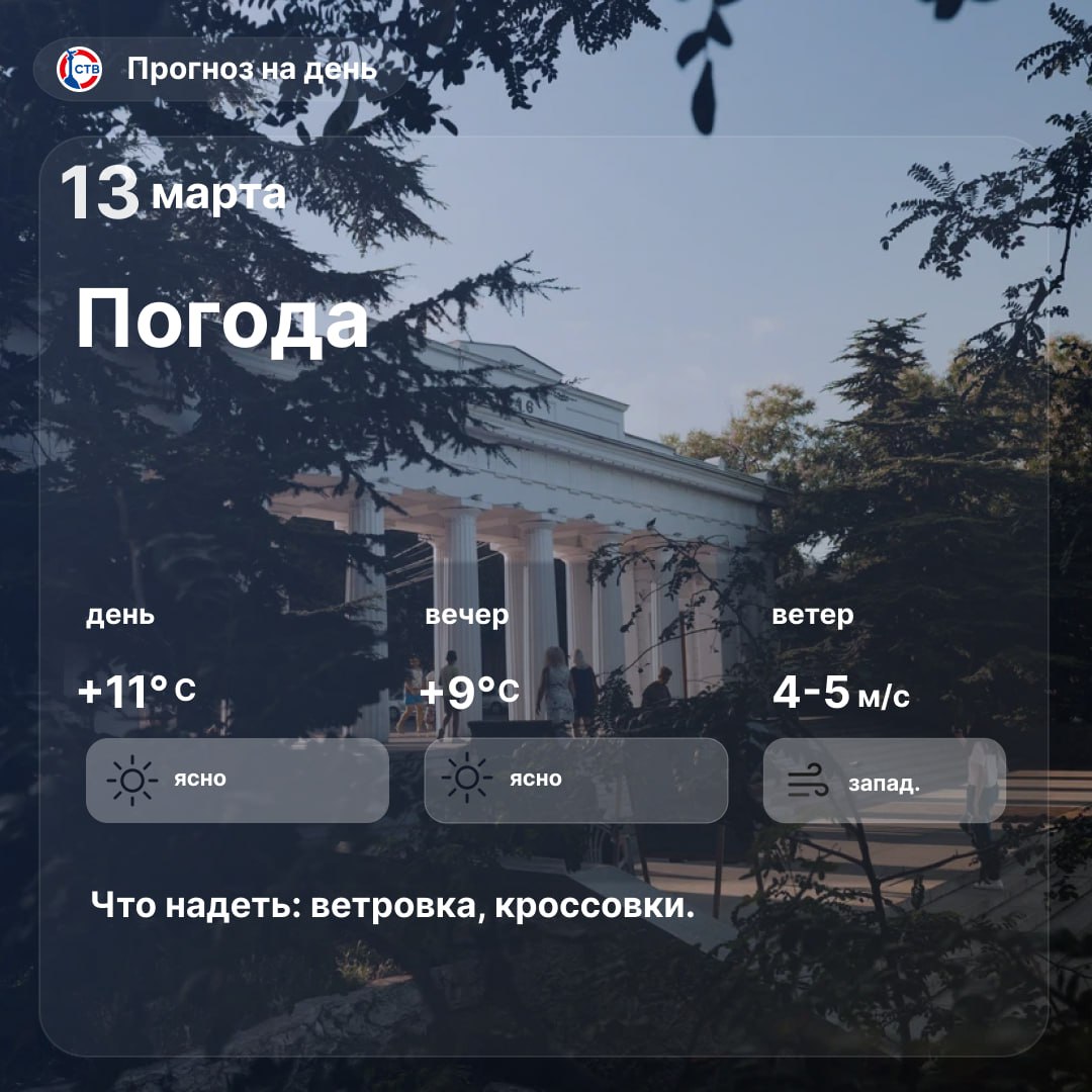 Здравствуй, Севастополь!По данным гидрометцентра, 13 марта в Севастополе будет переменная облачность. Осадков не ожидается. Ветер западный 5-10 м/с. Температура воздуха 10-15°С. МЧС России рекомендует чаще звонить родным, которые живут далеко, –...
