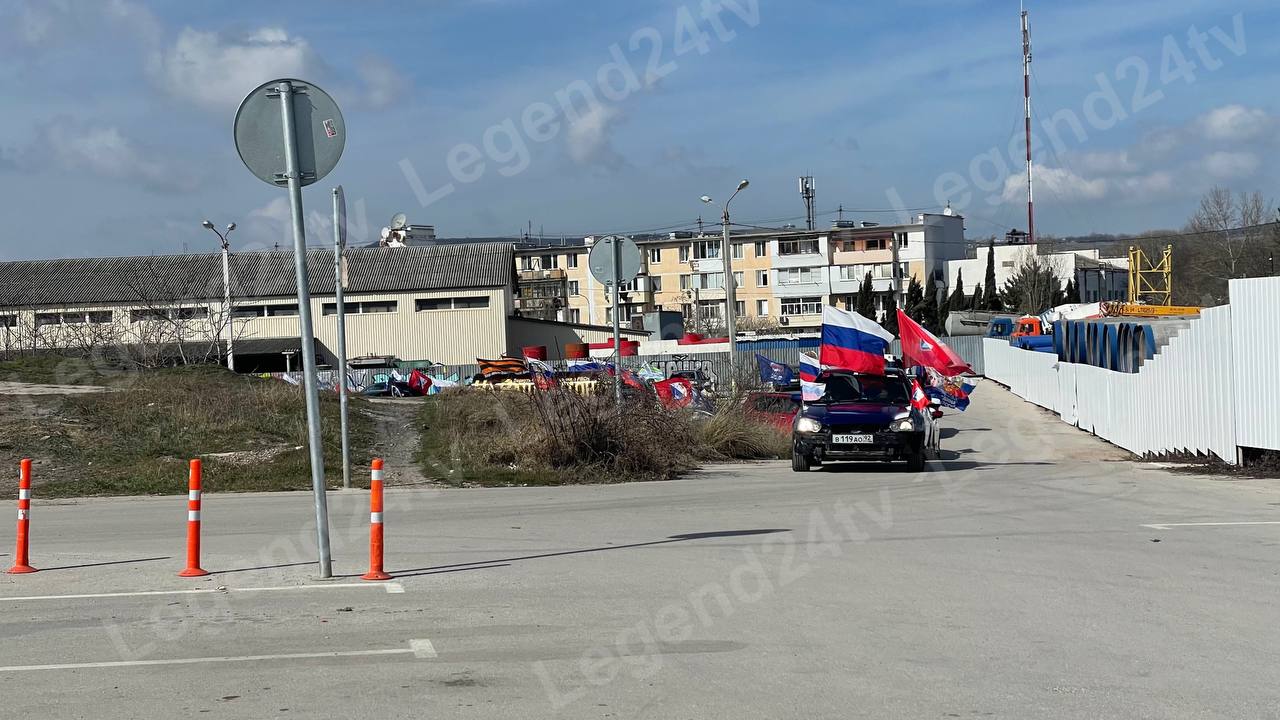 На дороге — атмосфера праздника. На машинах развеваются флаги Севастополя и России. Звучит музыка.
