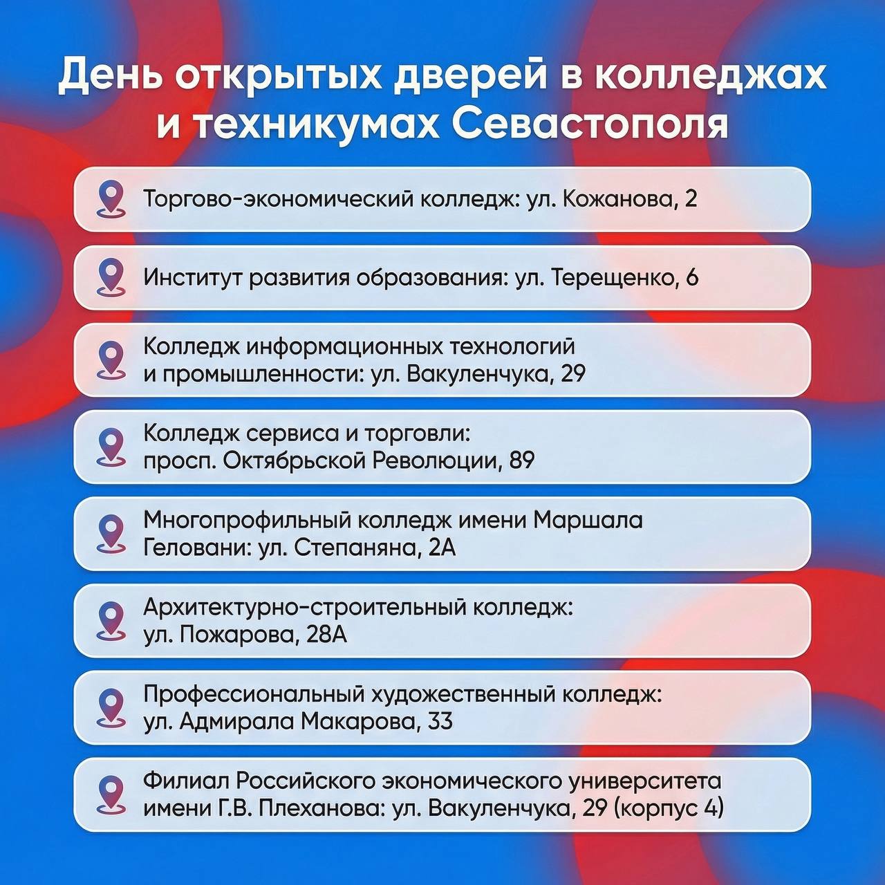 Учреждения среднего профессионального образования Севастополя приглашают выпускников. Им расскажут о правилах поступления, направлениях подготовки, перспективах трудоустройства, а также покажут учебные аудитории и мастерские.