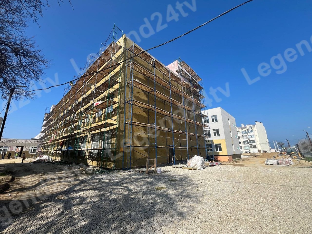 Строители выполняют фасадные работы снаружи и отделочные внутри помещений.