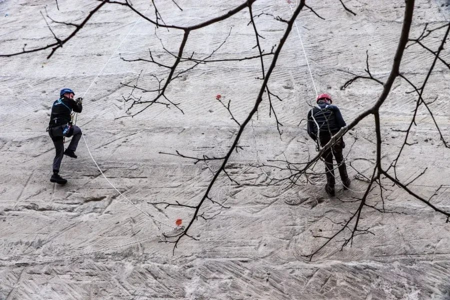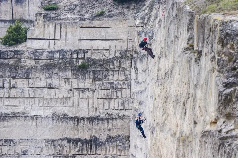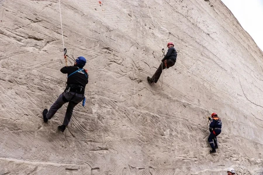 Спасатели тренировались спускаться и подниматься по вертикальным перилам, а также перемещаться по горизонтальным — такие навыки необходимы при работе в горах.