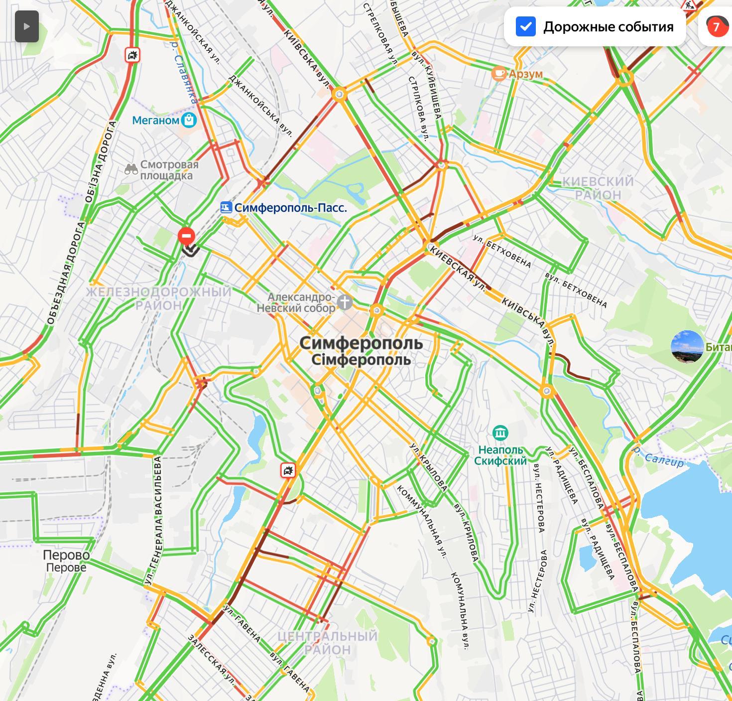 Самые сильные заторы в районе улиц Севастопольская, Воровского, Киевская, Русская, Куйбышева, Гагарина, проспекта Победы, следует из данных сервиса "Яндекс.Пробки".