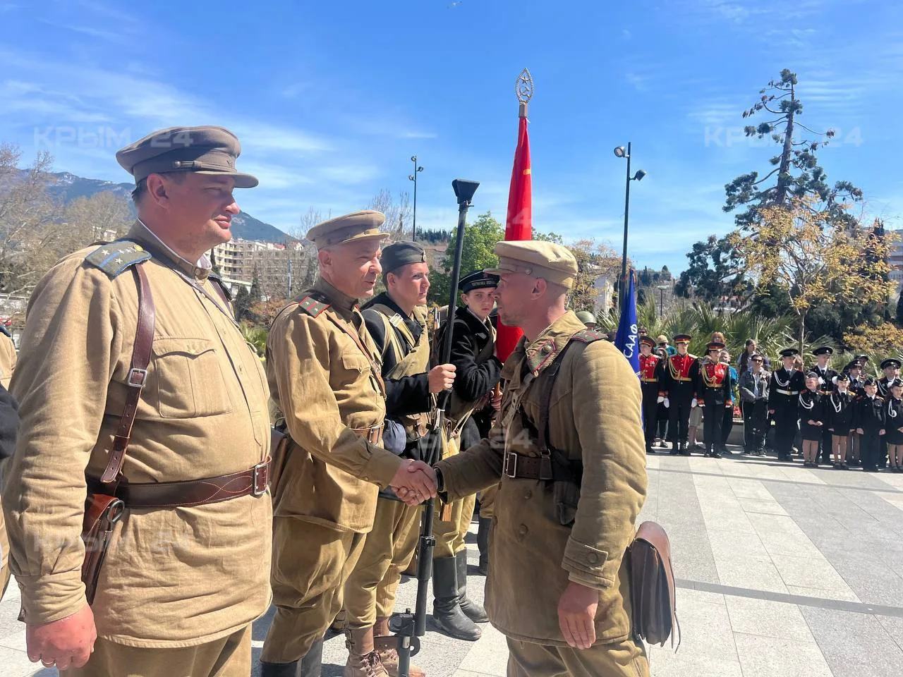На Советской площади под духовой оркестр встретили участников проекта «Дорогами освободителей». Они проходят 280-километровый маршрут по следам красноармейцев. Следующая остановка реконструкторов — Севастополь.