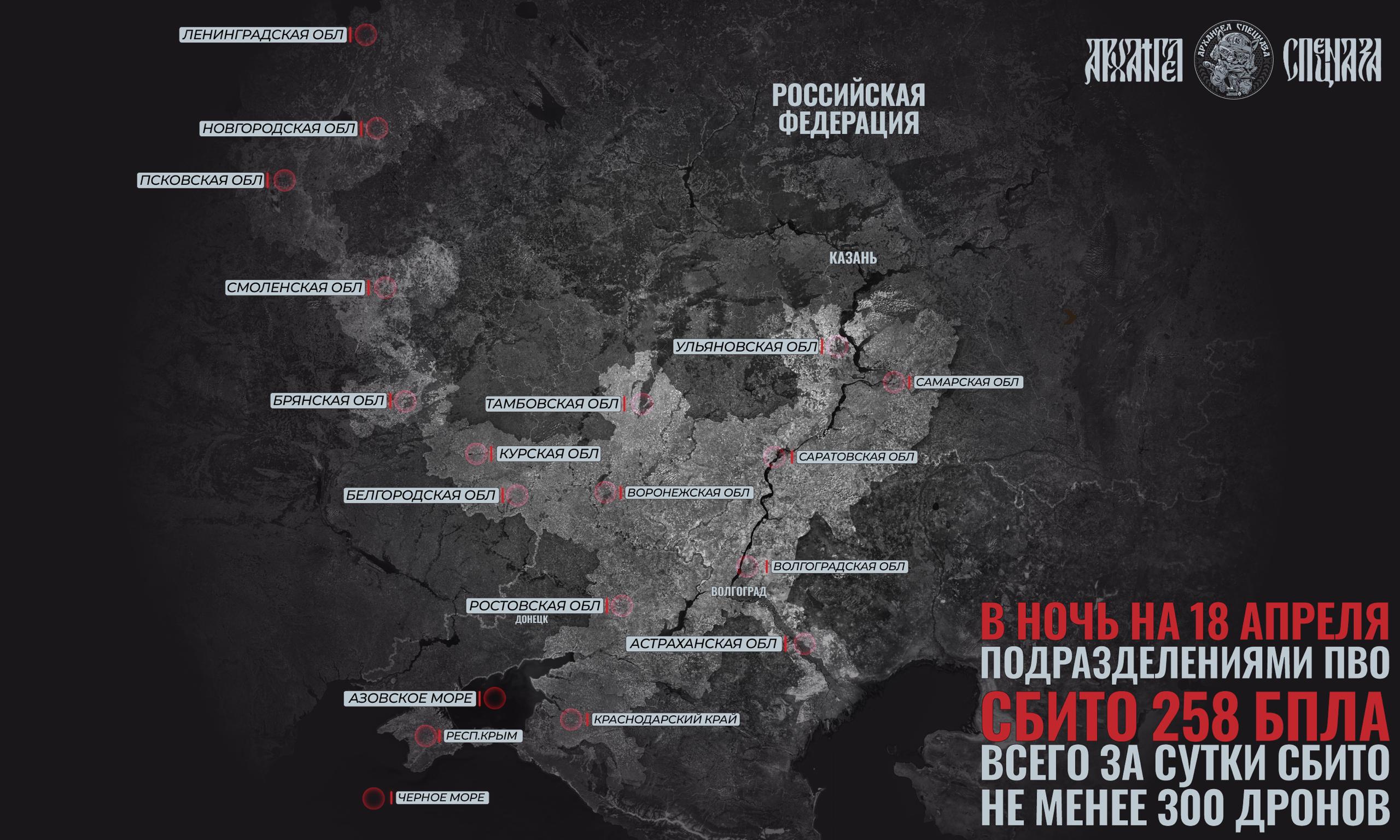 Подразделениями ПВО за ночь было сбито не менее 258 беспилотников. Всего за сутки с утра 17 апреля зафиксировано не менее 300 дронов.