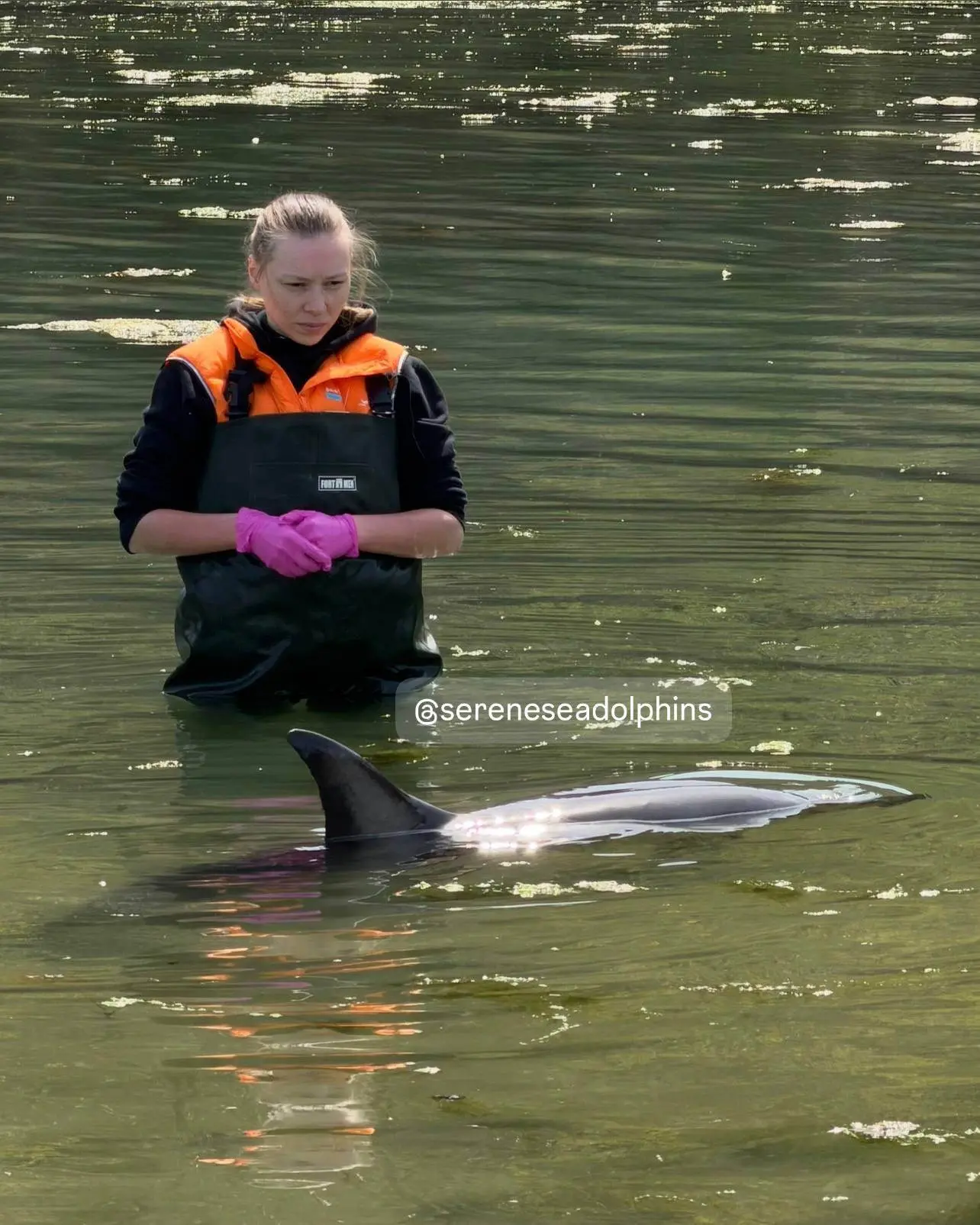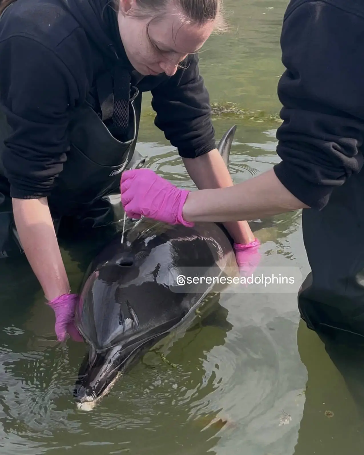 По результатам узи и исследований выявлено обезвоживание и признаки энтерита, вероятно, вирусной этиологии. Ветеринары организовали полевой лагерь с посменными дежурствами в воде.