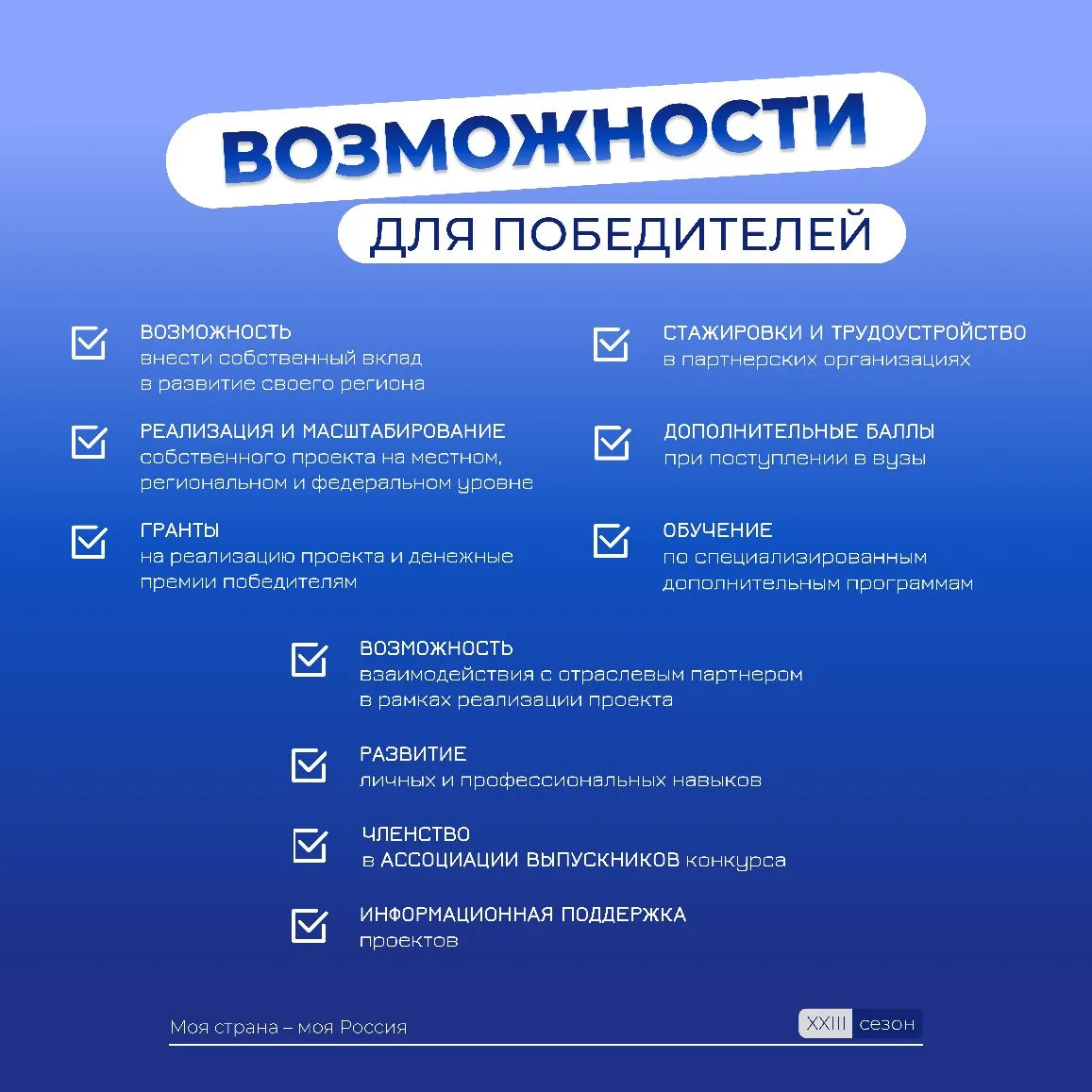 Всероссийская ассоциация развития местного самоуправления (ВАРМСУ) информирует о проведении в 2026 году XXIII Всероссийского конкурса молодежных авторских проектов и проектов в сфере образования, направленных на социально-экономическое развитие российских территорий – «Моя страна – моя Россия». Регистрация и подробная информация о конкурсе на сайте https://moyastrana.ru/?lang=tr