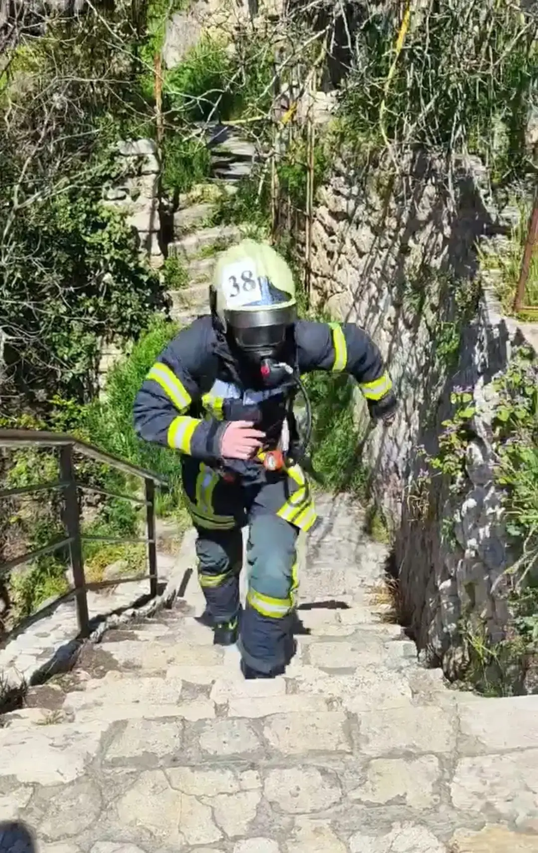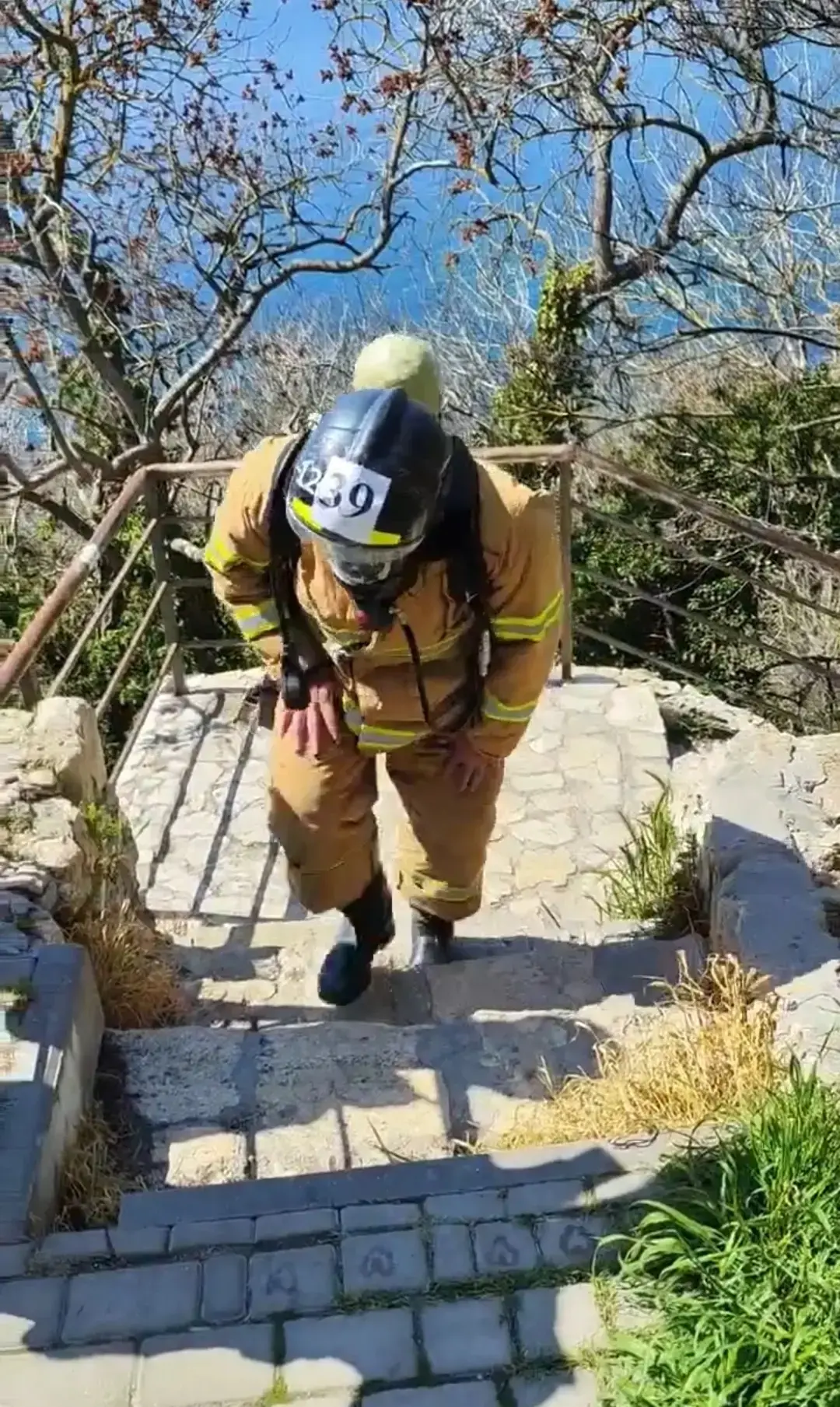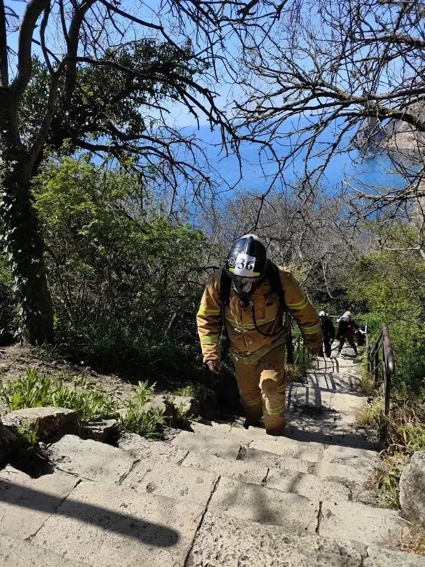 Участникам предстояло преодолеть почти 800 ступеней на мысе Фиолент в полной боевой экипировке — в пожарной одежде и с включением в аппараты на сжатом воздухе.