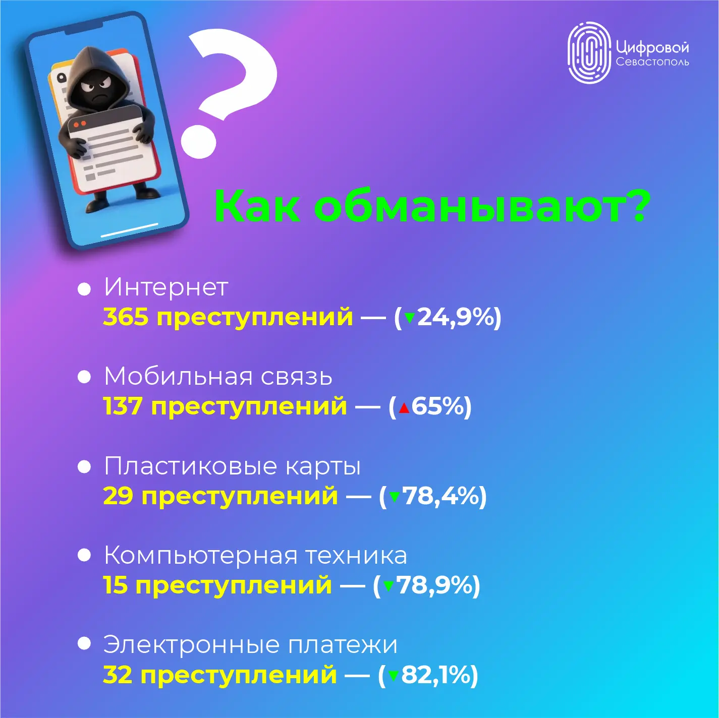 По данным УМВД Севастополя за 3 месяца 2026 года было зафиксировано 487 случаев преступлений (41,7%), совершенных с использованием информационно-телекоммуникационных технологий.