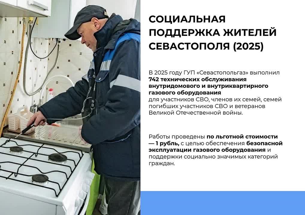 В 2025 году ГУП «Севастопольгаз» продолжил системную работу по обеспечению безопасной эксплуатации внутридомового и внутриквартирного газового оборудования, уделяя особое внимание социально значимым категориям граждан.