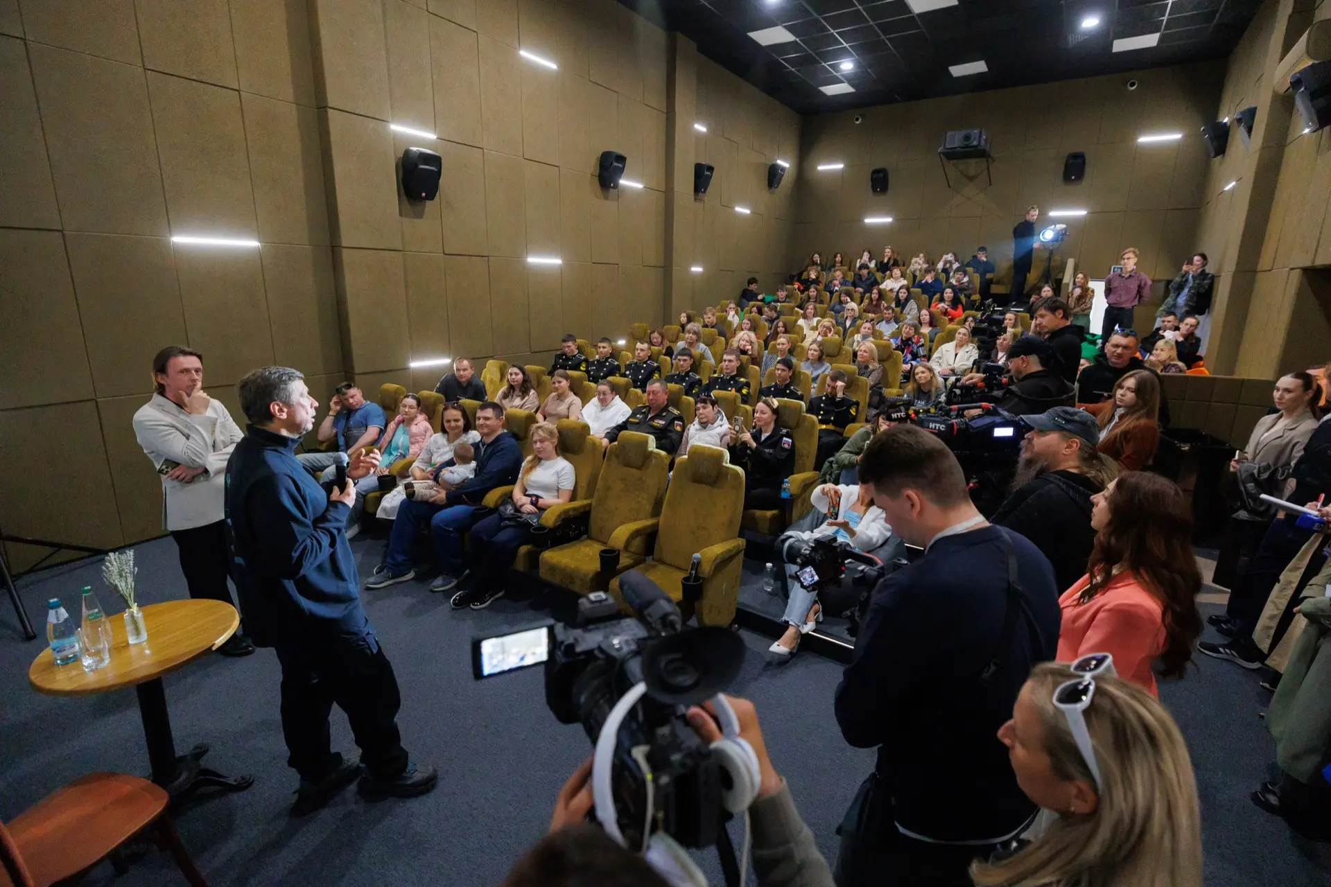Встреча с Андреем Мерзликиным, российским актёром театра, кино, телевидения, озвучивания и дубляжа, кинорежиссёром и телеведущим, Заслуженным артистом Российской Федерации, прошла сегодня в кинотеатре "Одиссей" в Новом Херсонесе.
