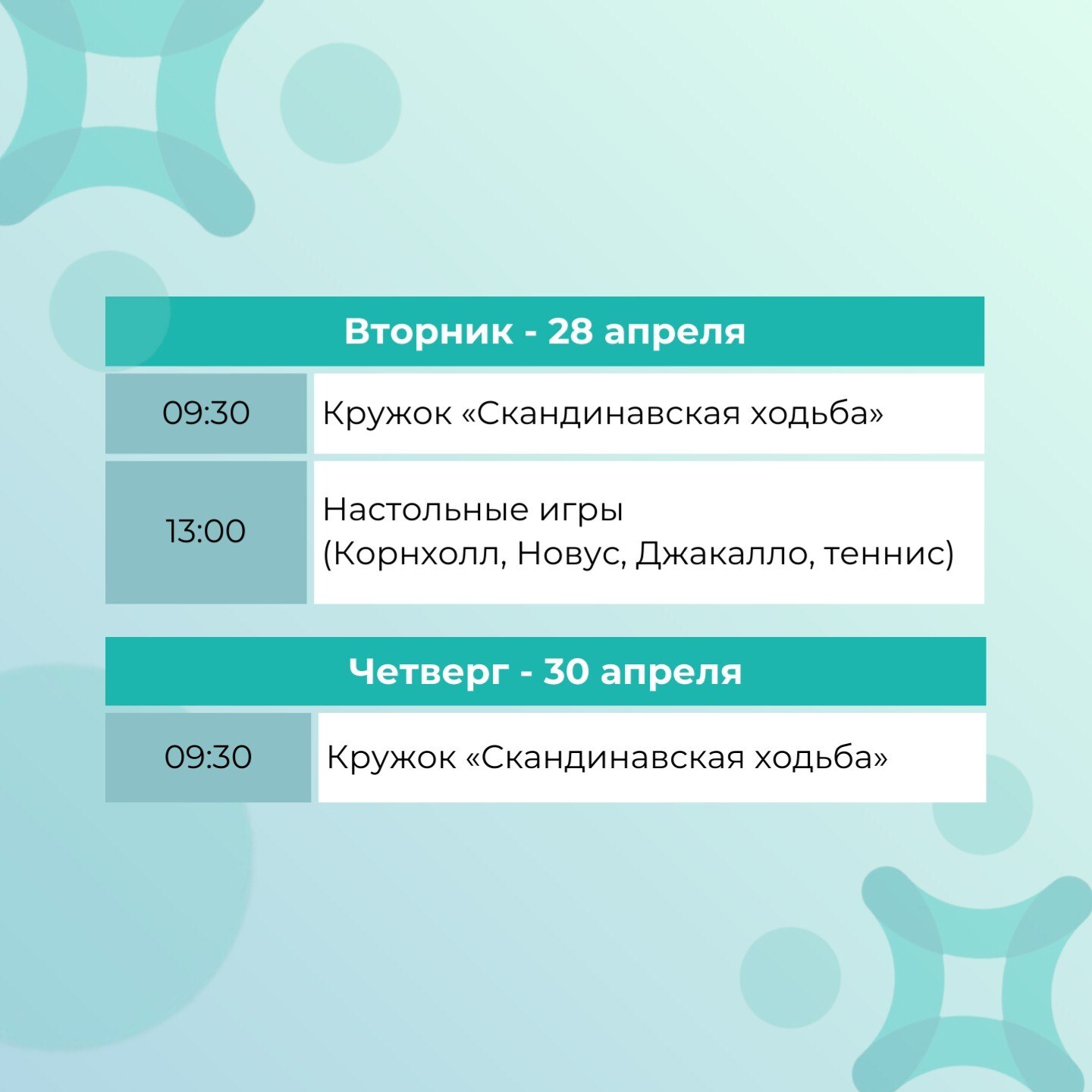 Расписание кружков на этой неделе для старшего поколения смотрите в карточке к посту. Не забудьте рассказать своим бабушкам и дедушкам, как они могут провести досуг!