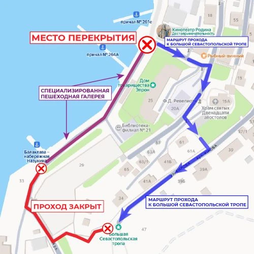 Это связано со строительством яхтенной марины и канализационного коллектора. Так будет ограничен проход от дома №23 в сторону выхода из Балаклавской бухты, включая лестницу к Большой севастопольской тропе. Об сообщили в правительстве Севастополя.