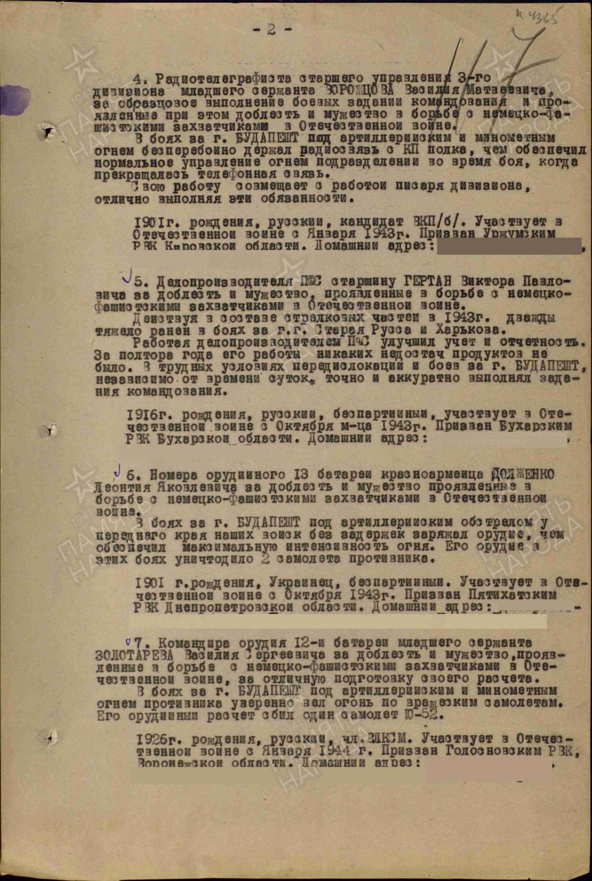 В документе о награждении медалью «За боевые заслуги» сообщается, что командир орудия 12-й батареи младший сержант Золотарев удостоен награды за доблесть и мужество, проявленные в борьбе с немецко-фашистскими захватчиками, и за отличную подготовку своего расчета: «Во время боев за город Будапешт он под артиллерийским и минометным огнем противника уверенно вел огонь по вражеским самолетам. Его орудийный расчет сбил один самолет Ю-52».